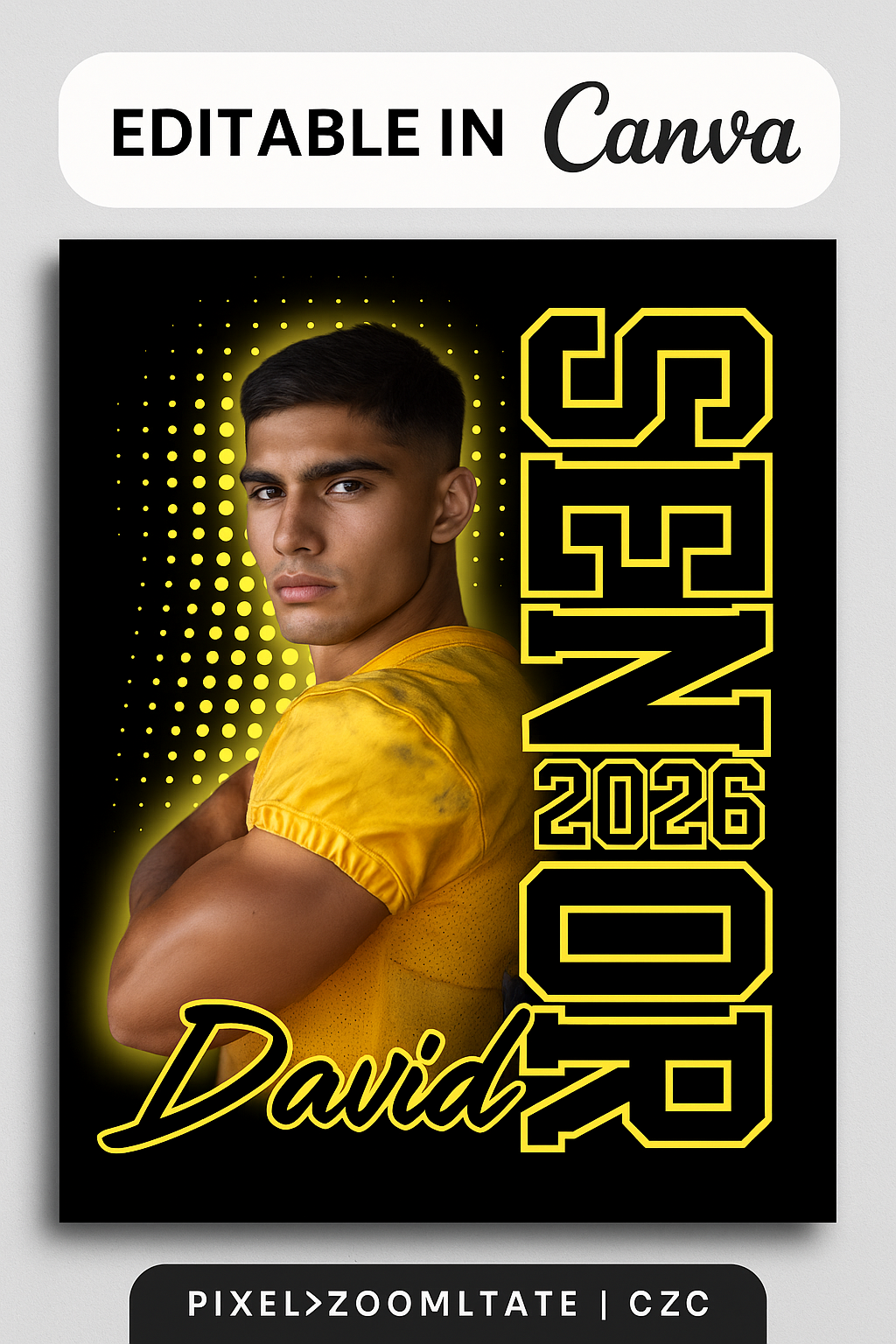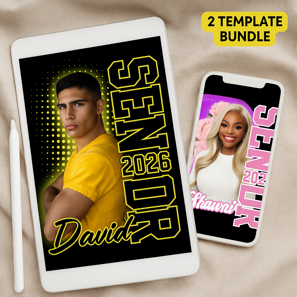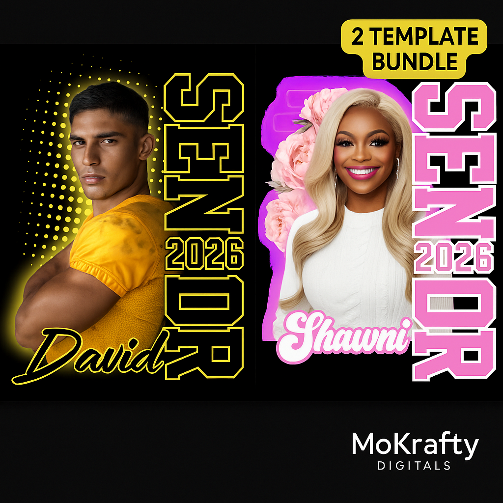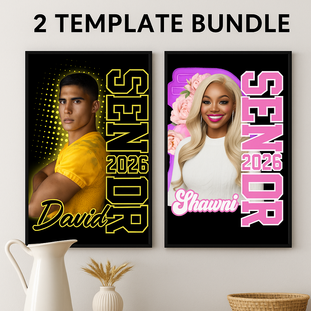 This bundle includes 2 fully editable Canva templates—a bold sports-themed design and a glam floral design—perfect for creating personalized senior night posters, graduation banners, social media graphics, and keepsakes.