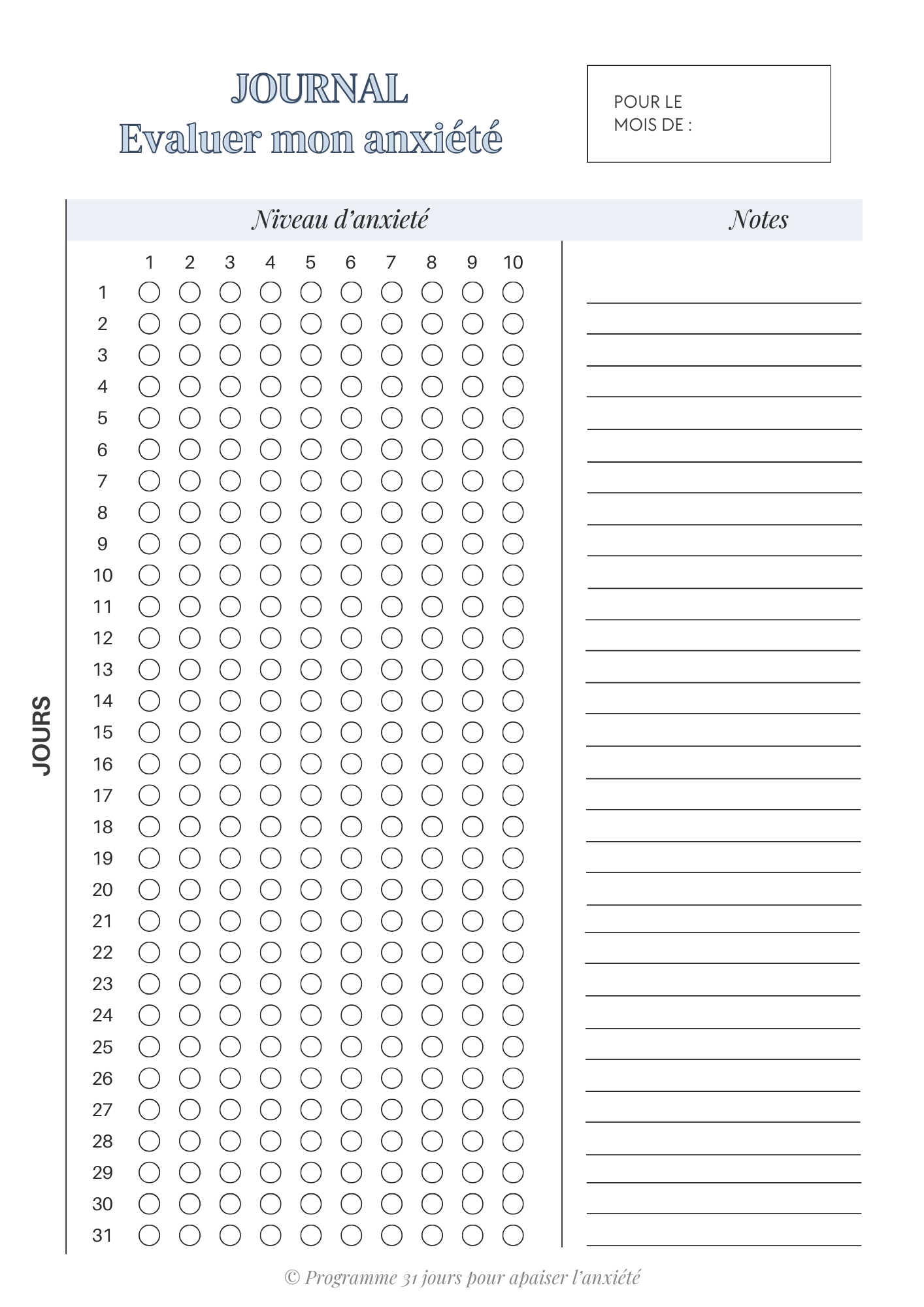 - Un tableau pour évaluer votre anxiété : Identifiez vos déclencheurs, évaluez vos symptômes et suivez votre évolution au fil des jours. Ce tableau vous permet de mieux comprendre vos réactions et d'adapter vos stratégies de gestion de l'anxiété.