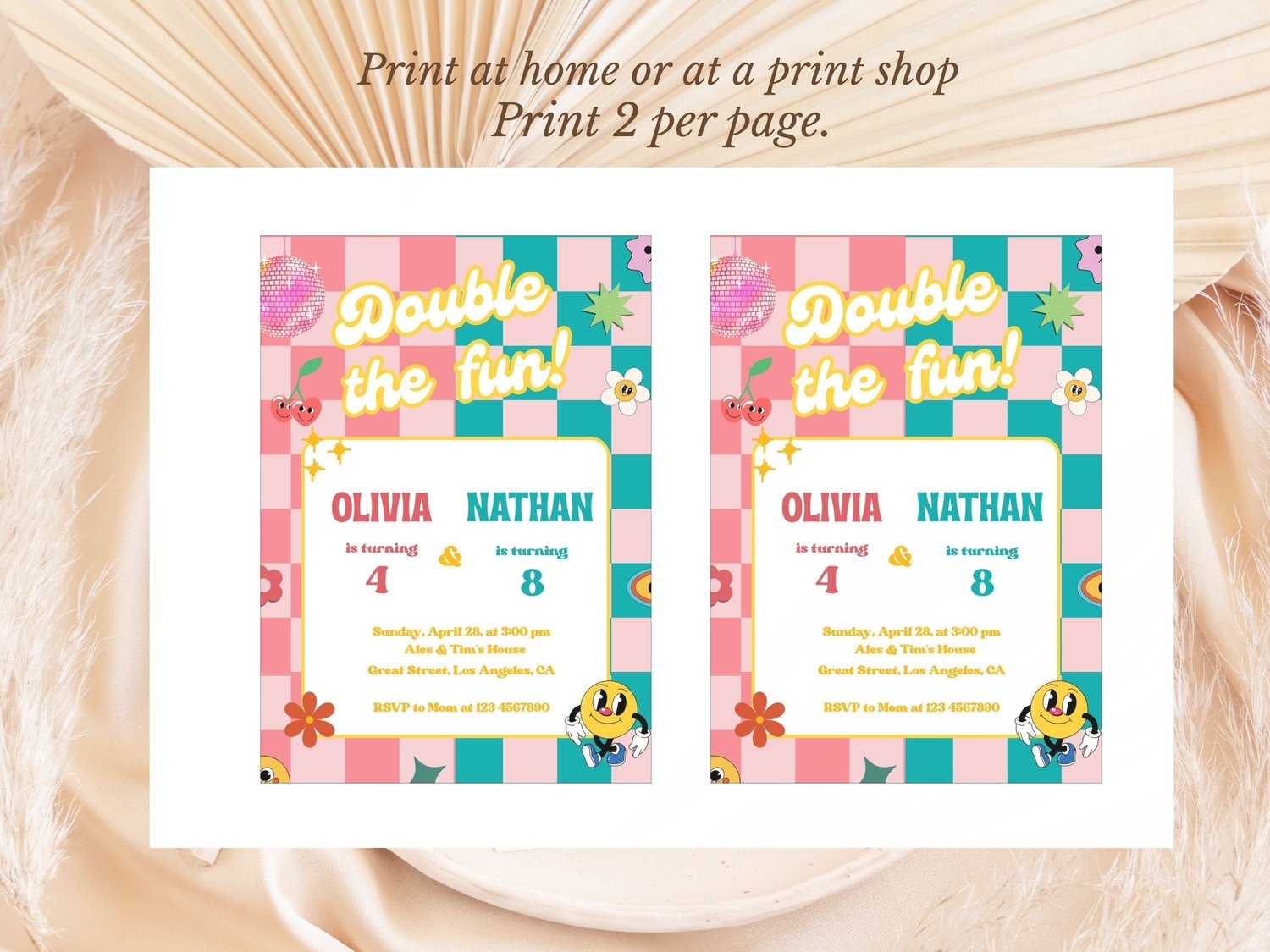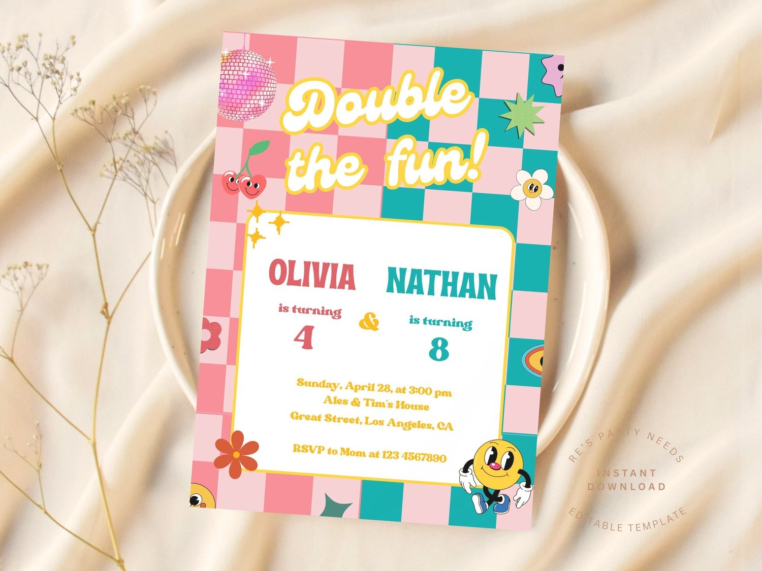 Boy Girl Sibling Birthday Invitation, Joint Birthday Party, Double Birthday Invite, Retro Groovy Smile Checker, Editable Canva Template
