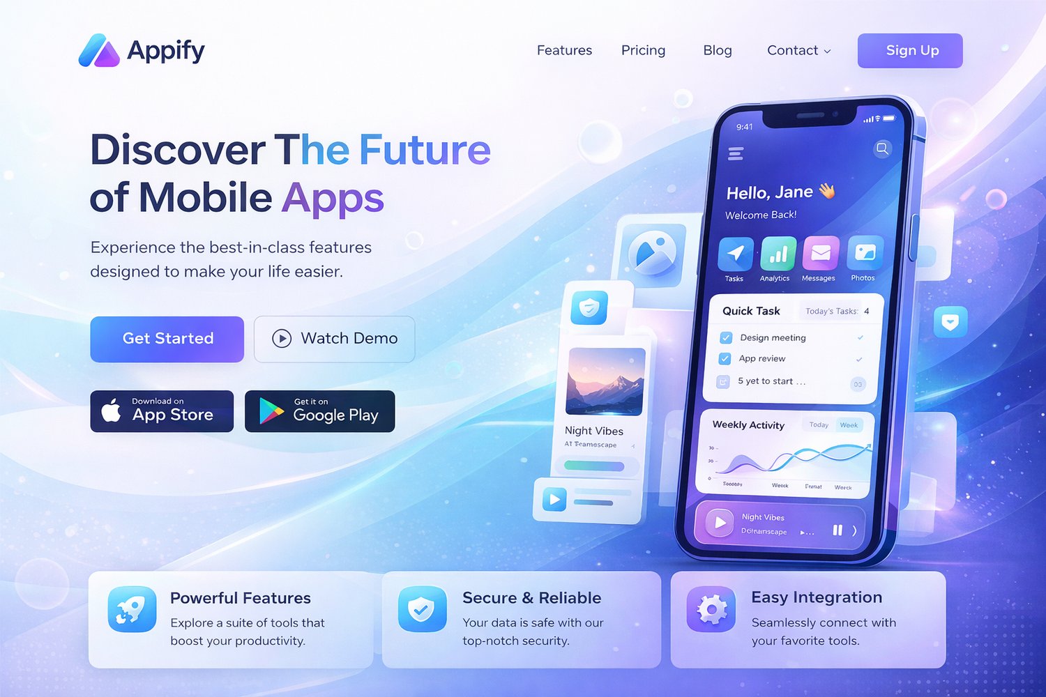 Appify is a clean, professional one-page website tailored for mobile app startups, indie developers, and product launches. It helps you showcase your app's core features, build user trust, and drive installs through prominent App Store and Google Play buttons.