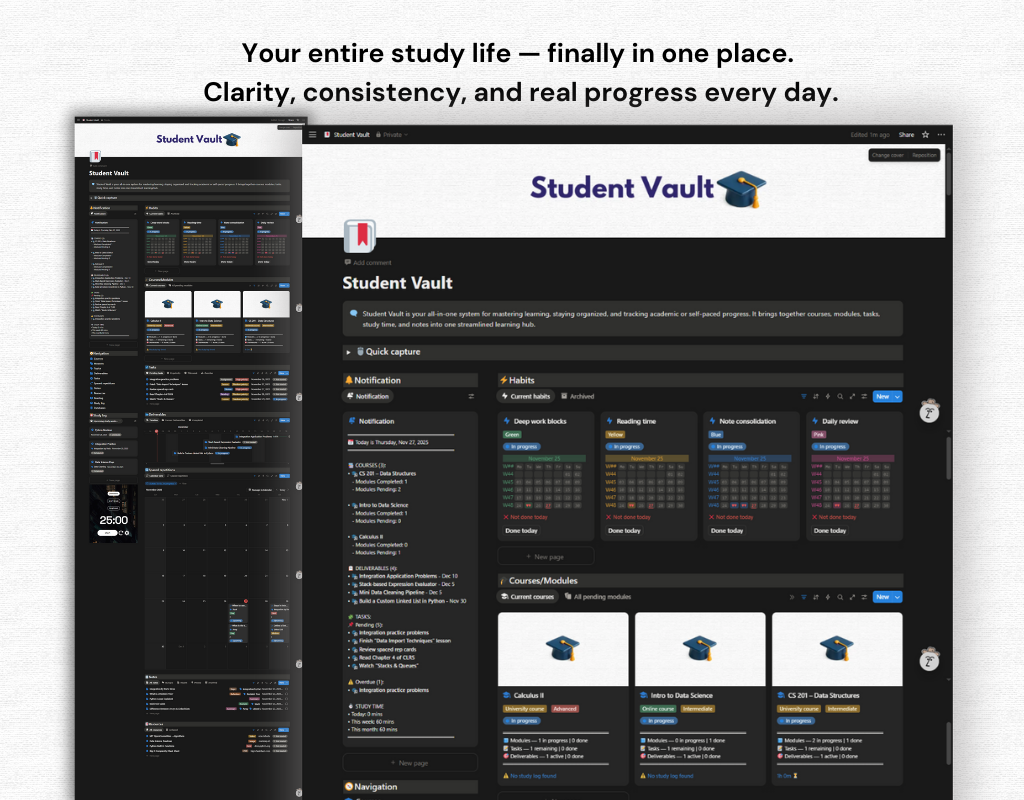 Student Vault is a complete learning management system designed for self-learners, college students, online-course takers, and anyone serious about mastering new knowledge. It transforms scattered notes, random study sessions, and unstructured progress into a streamlined, intentional learning workflow.