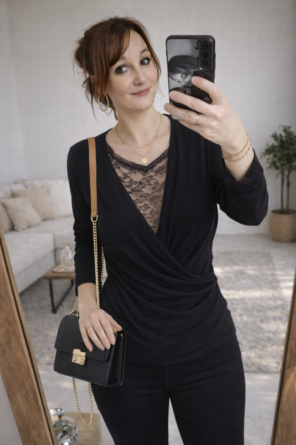 Top noir à col V drapé, avec un empiècement en dentelle qui apporte tout de suite une touche féminine et élégante.