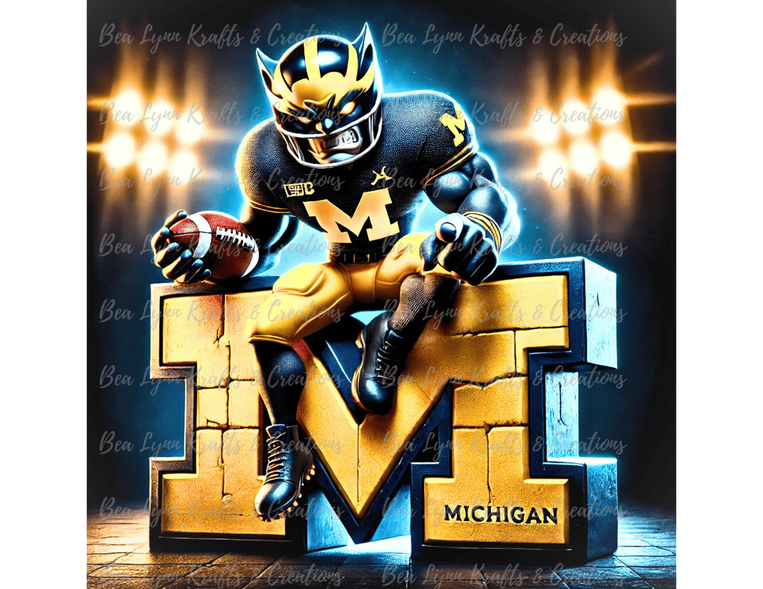 Bring the heat to your game day gear with this electrifying Michigan Football-inspired PNG! Featuring a bold, armored mascot locked in a powerful pose atop a cracked, stone-textured "M" logo, this high-energy artwork screams strength, school pride, and unstoppable team spirit. With dramatic lighting and intense athletic flair, it's made to hype up any true fan of the maize and blue!