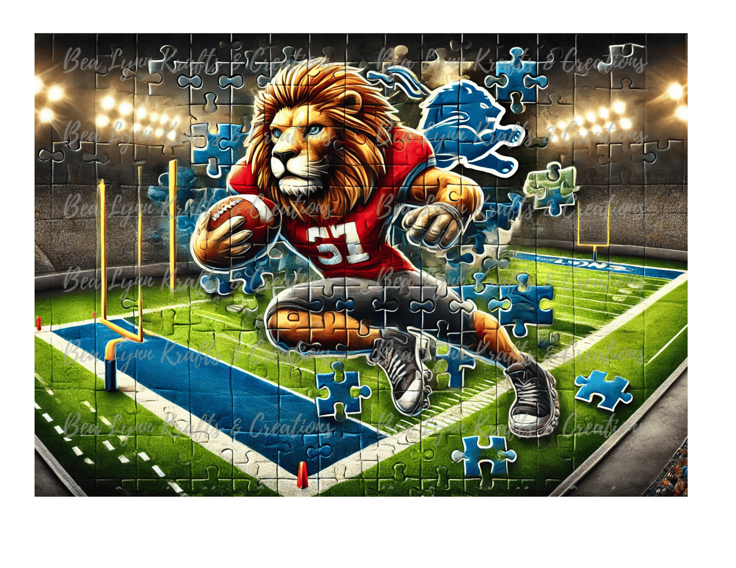 Unleash your Lions pride with this unique and electrifying transparent PNG! Featuring the iconic Lions mascot and football field, designed to look like interlocking puzzle pieces, this image is bursting with bold colors and intricate details. It’s the ultimate way to showcase your team spirit and create standout projects that roar with energy and creativity.