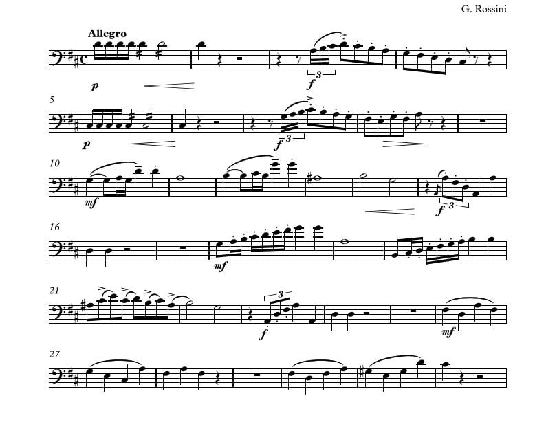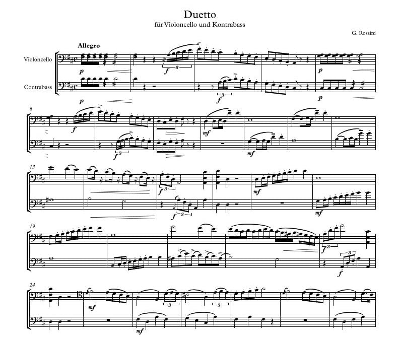 Eines der bekanntesten Originalwerke für Violoncello und Kontrabass. Und in typisch rossinischer Manier: Musikalisch leichtfüßig, eingängig beschwingt und unschuldig. Dabei sind beide Stimmen gleichwertig anspruchsvoll. Diese Ausgabe enthält eine Lesepartitur und für jedes Instrument eine blätterbare(!) Einzelstimme. Die Kontrabass-Stimme liegt in Orchesterstimmung vor.