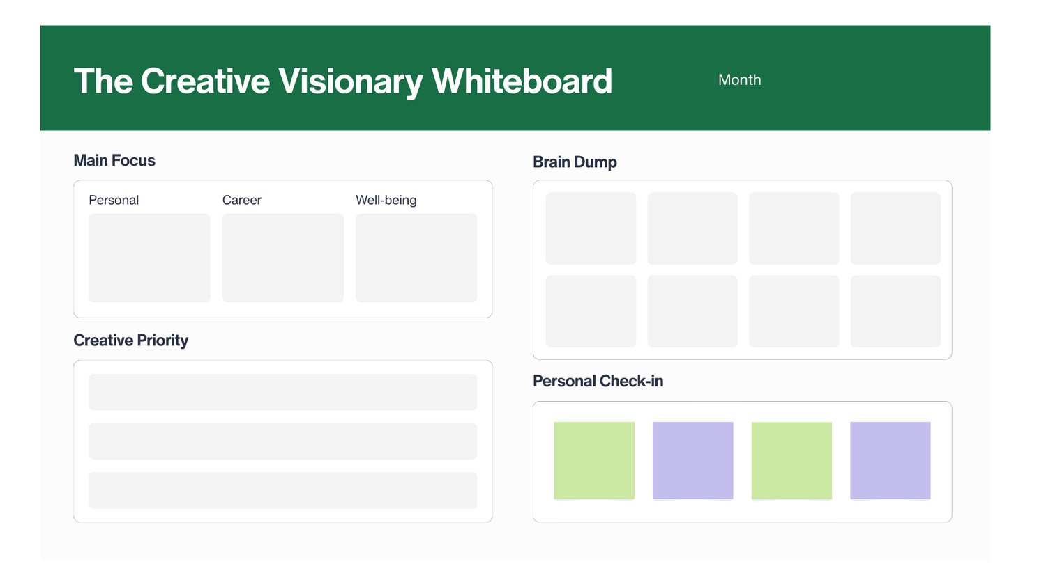 The Creative Visionary Whiteboard is a monthly grounding tool designed to help you focus without pressure, create without overwhelm, and move through your life and creativity with intention.