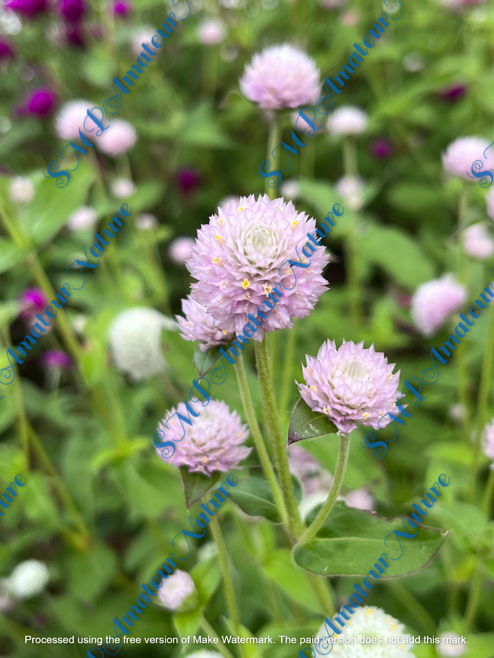 Amateur photograph of a patch of pink Globe Amaranth (Gomphrena globosa) flowers. Image taken in Virginia, USA. Image pixels 3024x4032. Image easily resized as required for buyer needs. Purchase gives image without any watermark.