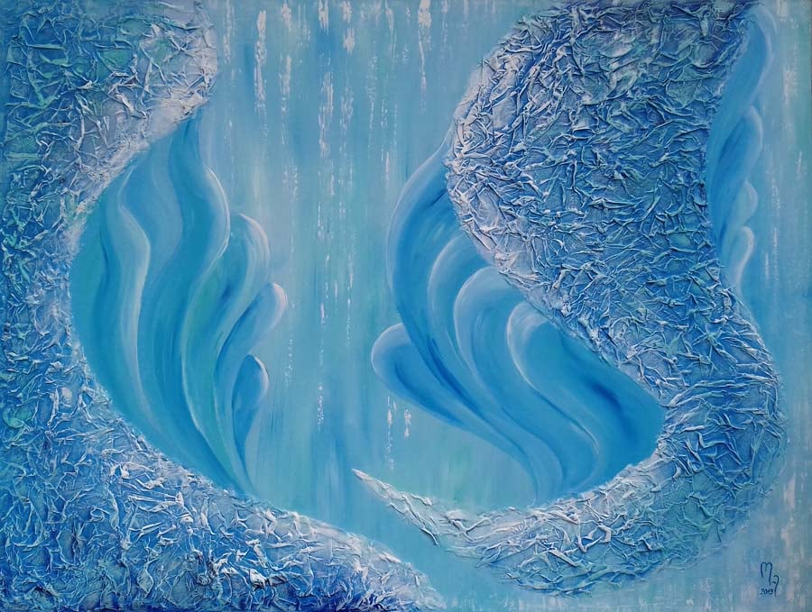The Power of Frost captures the essence of icy strength through textured layers of white, turquise, light blues. The composition evokes the intricate patterns of frost and the sharp, crystalline lines of frozen surfaces, bringing the chilling power of nature to life on canvas.