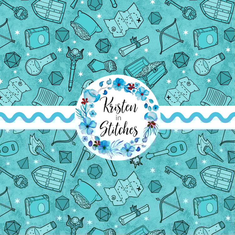 Fantasy game icons, including polyhedral dice, weapons, treasures and maps.