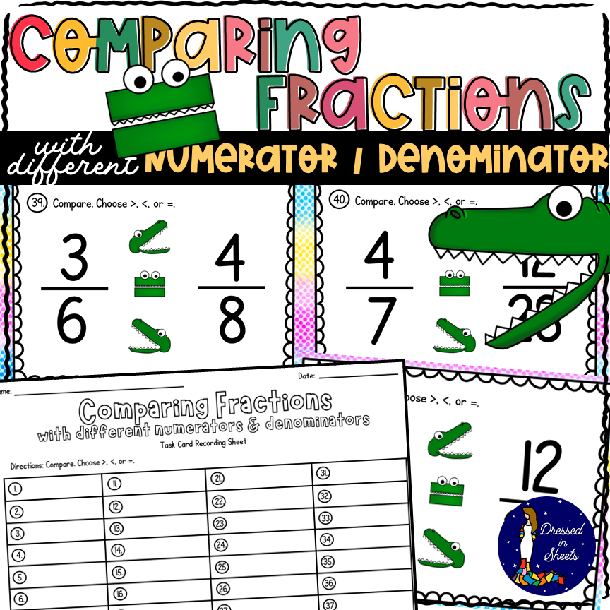 Get the practice your kiddos need in comparing fractions with different numerators and denominators. With the gators included students will be excited about their learning experience while they use >, <, or = to record their answers.