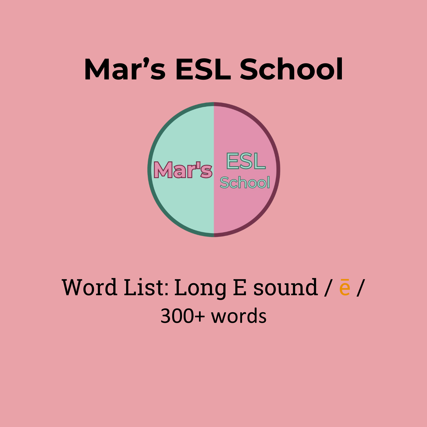 “English pronunciation is hard to master because you can’t always tell how a word is pronounced based on its spelling. This PDF download will give you a list of 300+ words that have a long E sound showing every possible spelling for this sound. Some examples are “ego,” “heat,” “chief,” "taxi," and “duty.” The list is yours forever. From the list, choose the words that you use every day and practice them in sentences. I’m available to provide support on how to take full advantage of this list. Visit marseslschool.com for more information.