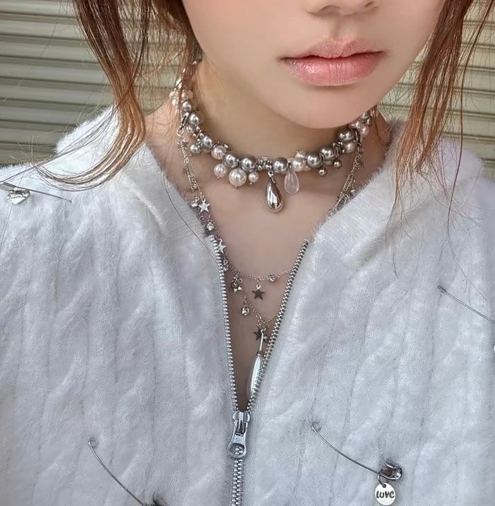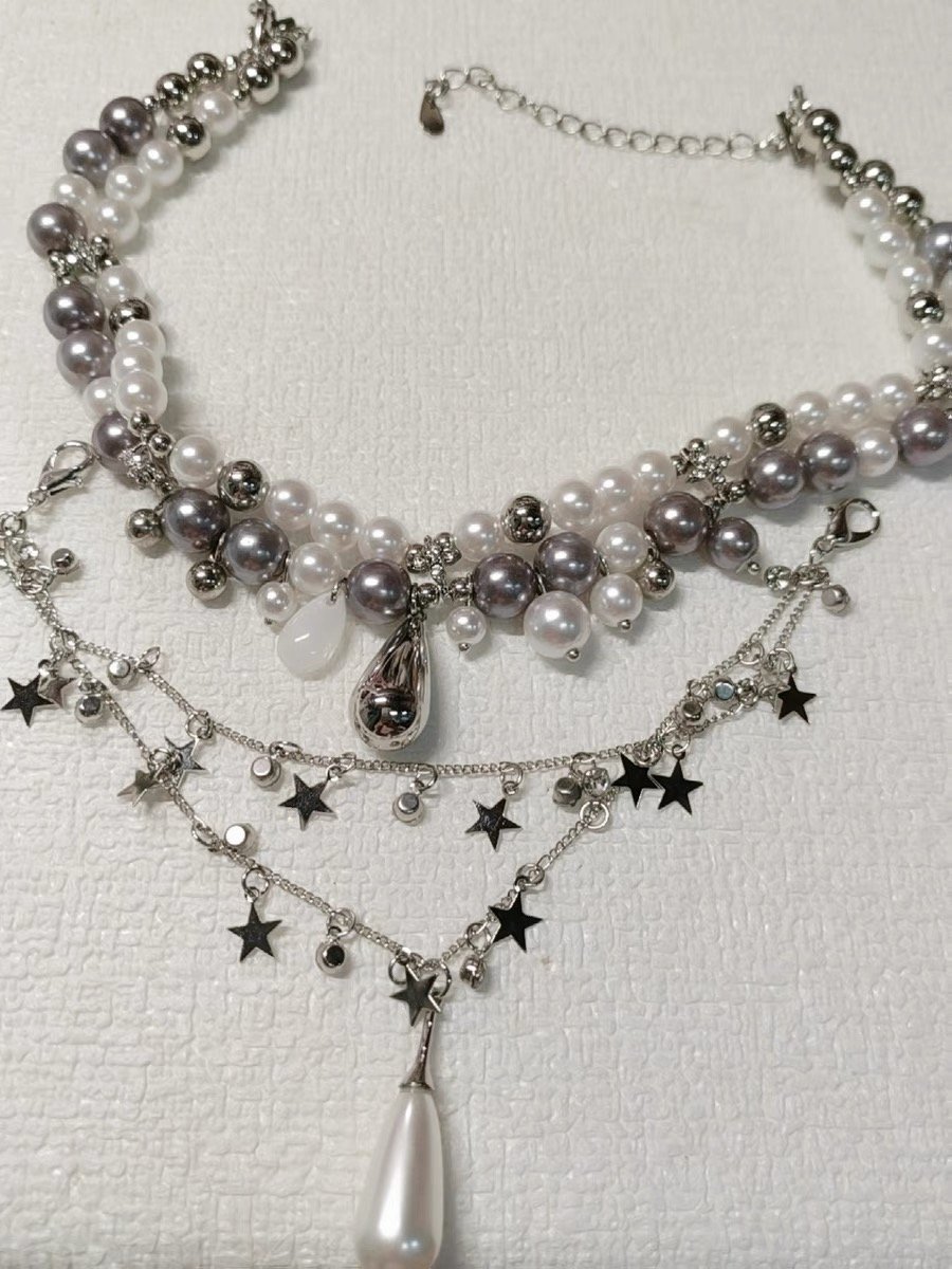French retro pearl double stacking titanium pendant necklace