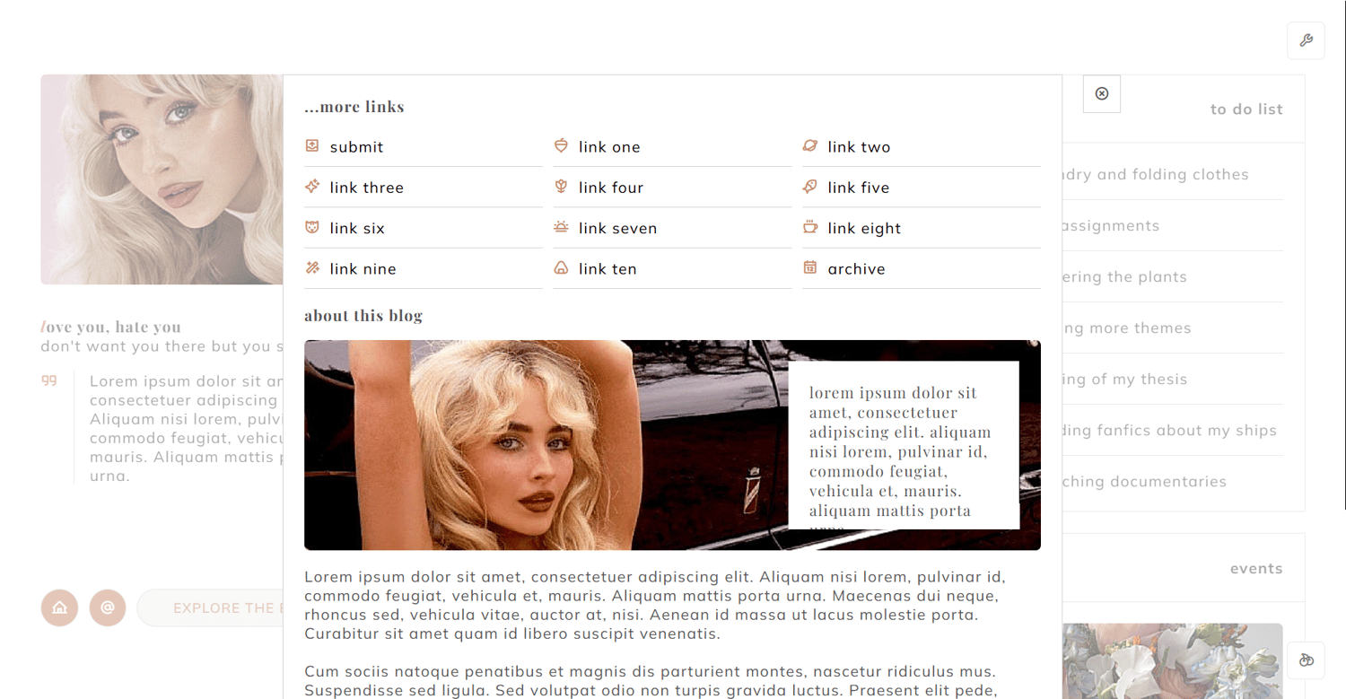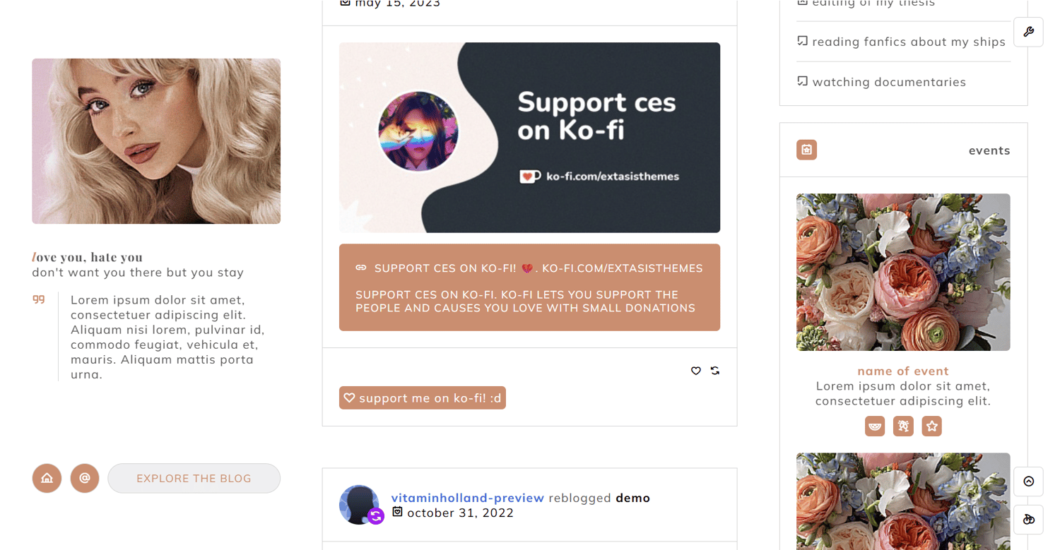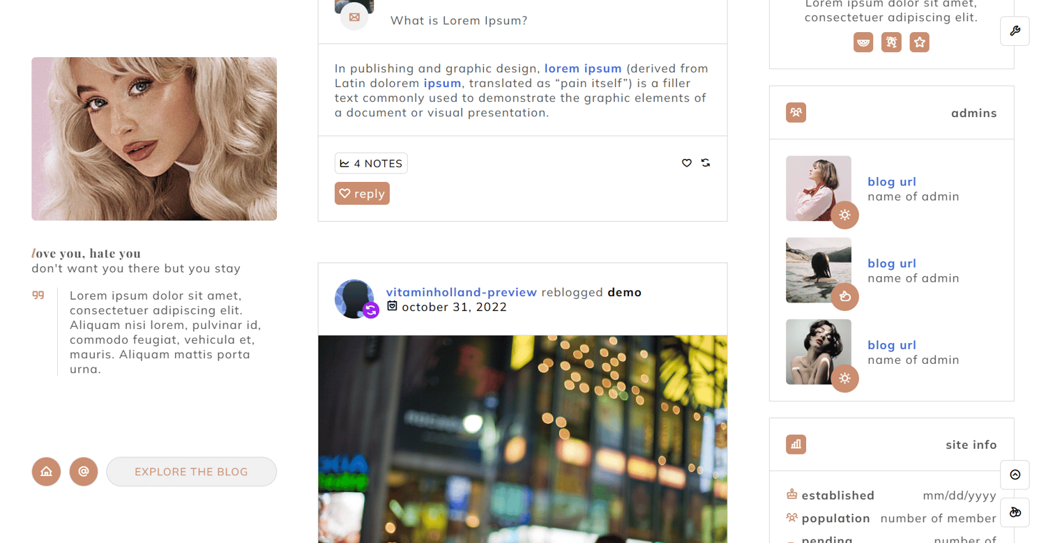 features: 300x200px sidebar image, blog title, blog subtitle, ten custom links, search bar, wid section; events section with 248x190px event image, event title, event description and event links; admins section with 80x80px admin image, admin status, admin blog url and admin name; site info section and additional notes section, 700x200px about image, about quote, about section, elsewhere section, 450px to 540px text posts