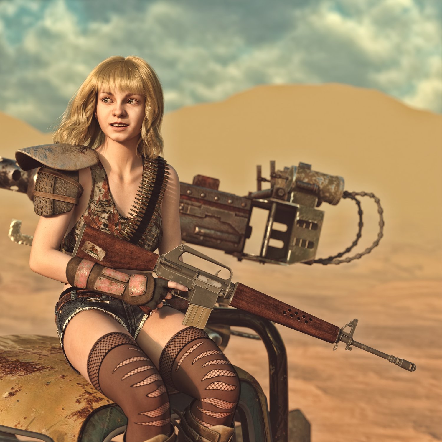 Planning to survive in a post nuclear wasteland? Then 3d rifle won't help you, but until then you can make cool postapocalyptic images in DAZ with it :) You might also have seen it in some very popular game. The prop is rigged and converted for use with DAZ. Trigger, safety, mag etc also rigged for more realistic pictures. Great or your survival grungy pics :)