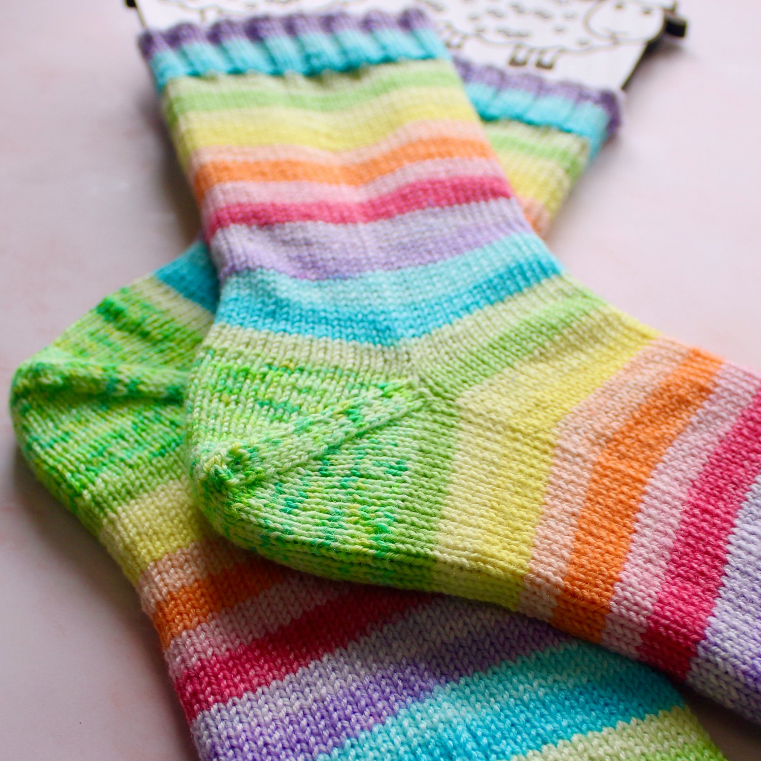 Since it is a plain sock, this pattern can accommodate a wide variety of colourway types. With this heel style, gradient, self-striping, and self-patterning yarns in particular can run uninterrupted around the heel.