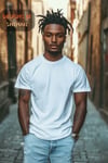 Showcase your designs in style with this high-resolution mockup featuring a confident Black male model in a crisp white t-shirt and urban alley background. Perfect for sublimation, DTF, or vinyl presentations!