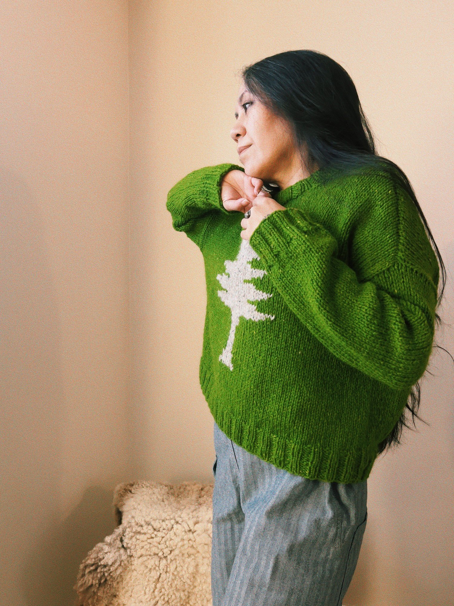 A subtle nod to Maine’s original flag, the tree motif on this pullover is knit using the intarsia method, which can be left off if desired. One of my most favorite things about woolen-spun yarns like Peace Fleece is the way they bloom to fill the spaces in and around the stitches worked at a slightly looser gauge, creating a soft, sweatshirt-like fabric.