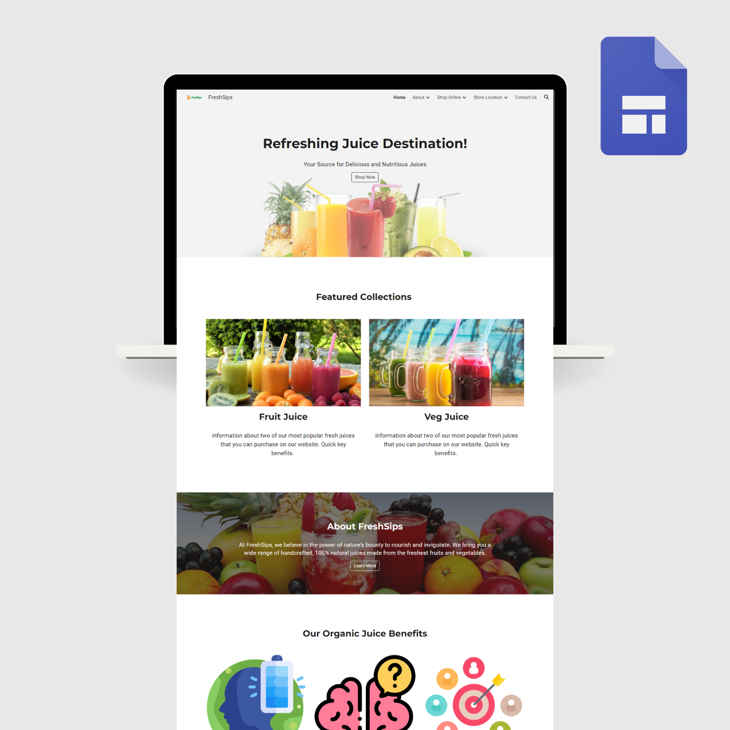 - Striking Visual Design: The "FRESHSIPS E-COMMERCE Google Site Website" template has been created to be simple, minimalistic and conversion-focused. Perfect for small businesses looking to set up, list, and sell products through their website.
