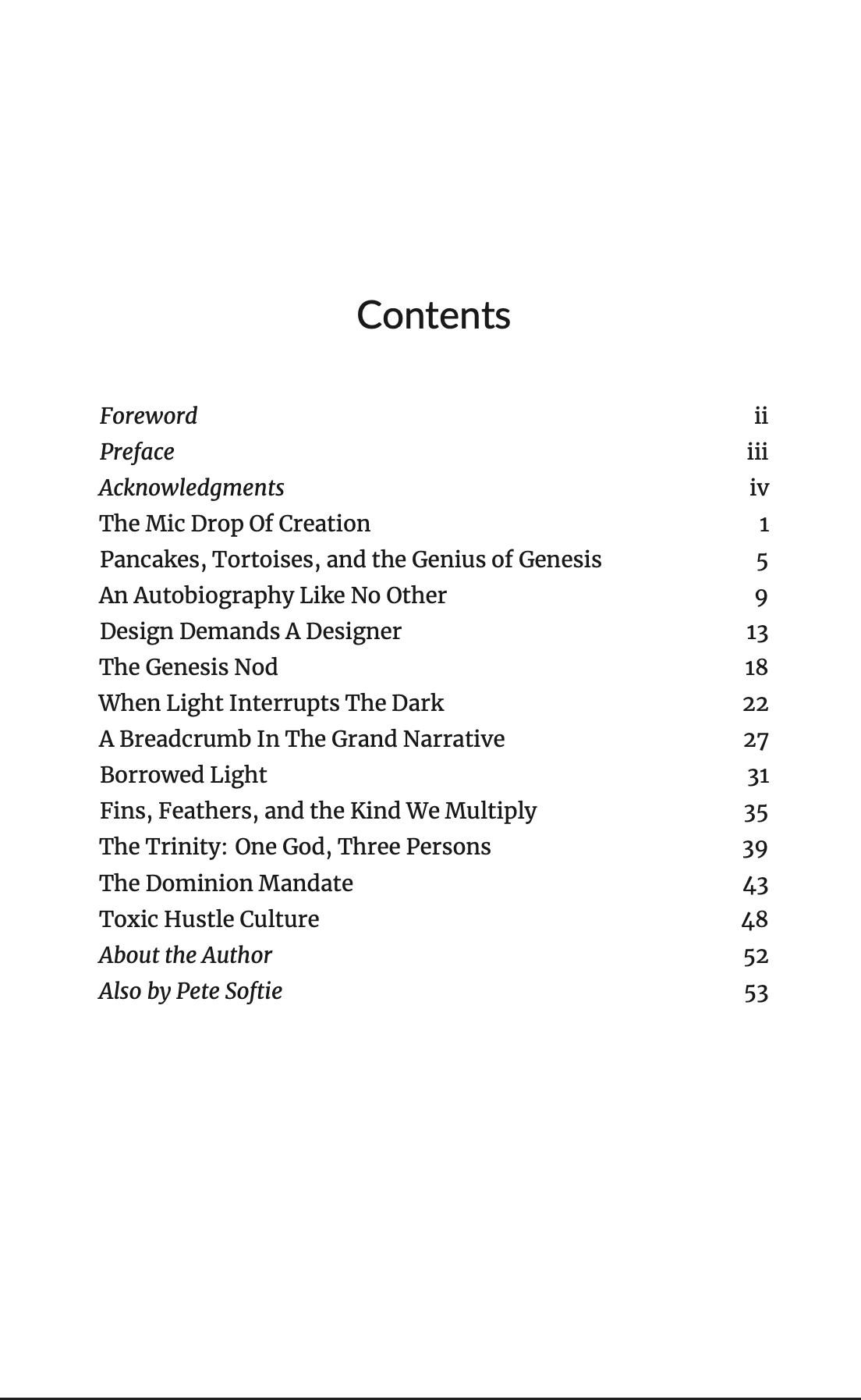 In the Beginning: Genesis One Devotional is a front-row seat to the most staggering opening act in history. From the mic-drop of “Let there be” to the hush of the seventh day, Pete Softie peels back the layers of Genesis 1 with wit, vivid storytelling, and theological depth.