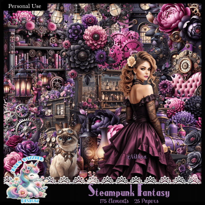 An elegant steampunk, kit to match ViNina's tube, Edith. There are 175 elements and 25 Papers, that are partially ai.