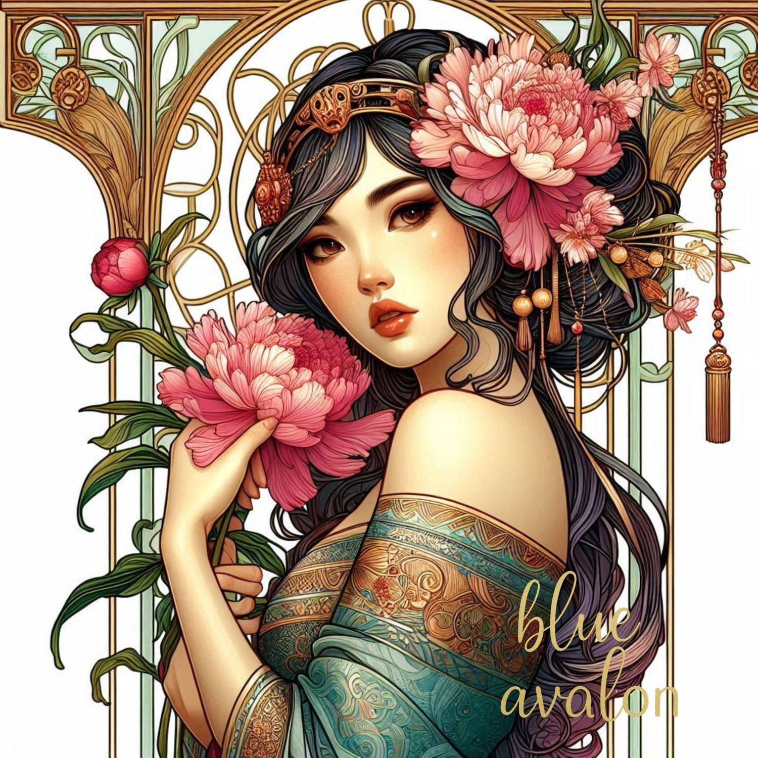 A breathtaking portrait in the spirit of Art Nouveau, featuring a photo-surreal Asian woman with serene beauty and timeless grace. Her gaze is soft, framed by delicate pink peonies. Behind her, intricate filigree patterns curl and flow - golden, floral, and ornamental - completing the composition with vintage elegance. The fusion of classic Nouveau curves and dreamy, modern surrealism makes this a striking and soulful piece.