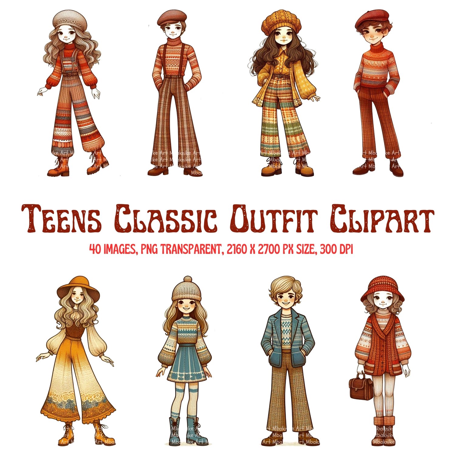 This digital product includes 40 images of Teen Classic Outfit Clipart in PNG Transparent format, 300 dpi, 2160x2700 px size.