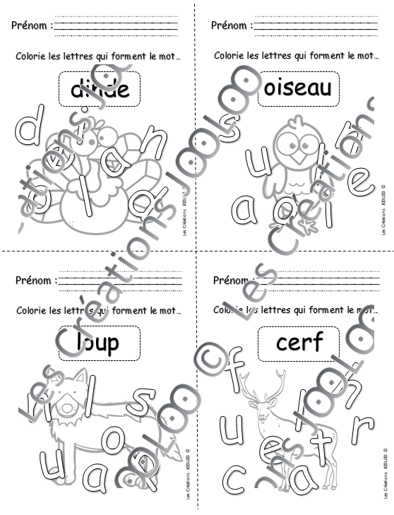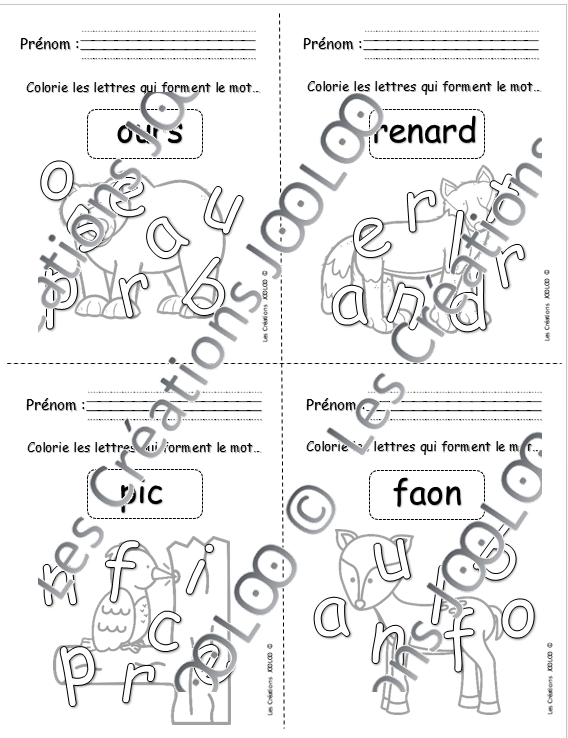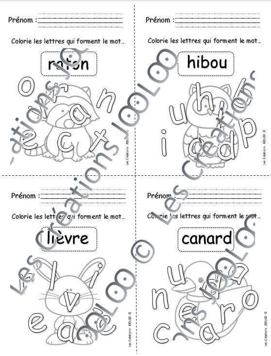 Voici un petit atelier simple et rapide pour les élèves du préscolaire. Excellent pour occuper les élèves pour un 5 minutes. Les élèves doivent colorier les lettres qui composent le mot. Il y a 4 mini-fiches par page. Idéal pour économiser du papier!