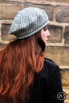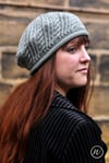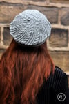 This wonderful beret uses bias knitting techniques, combining fine cables and eyelet panels to create this striking effect.