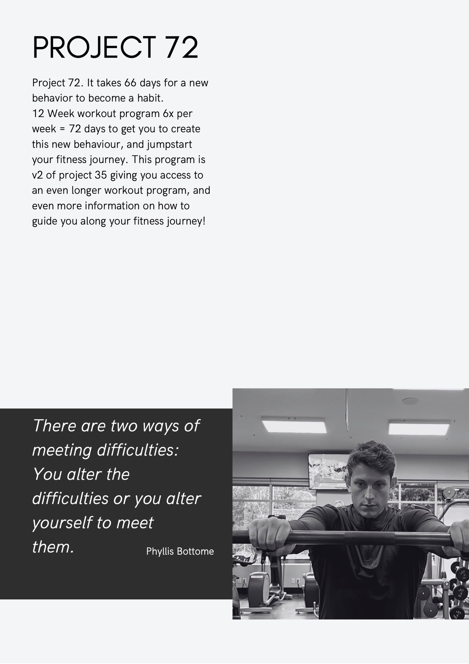 1. Project 72 is a brand new program with some foundations laid by Project 35. You do not need to do Project 35 before using Project 72, but I do recommend it. Project 72 blends calisthenics and bodybuilding giving a motivating and effective way to train.