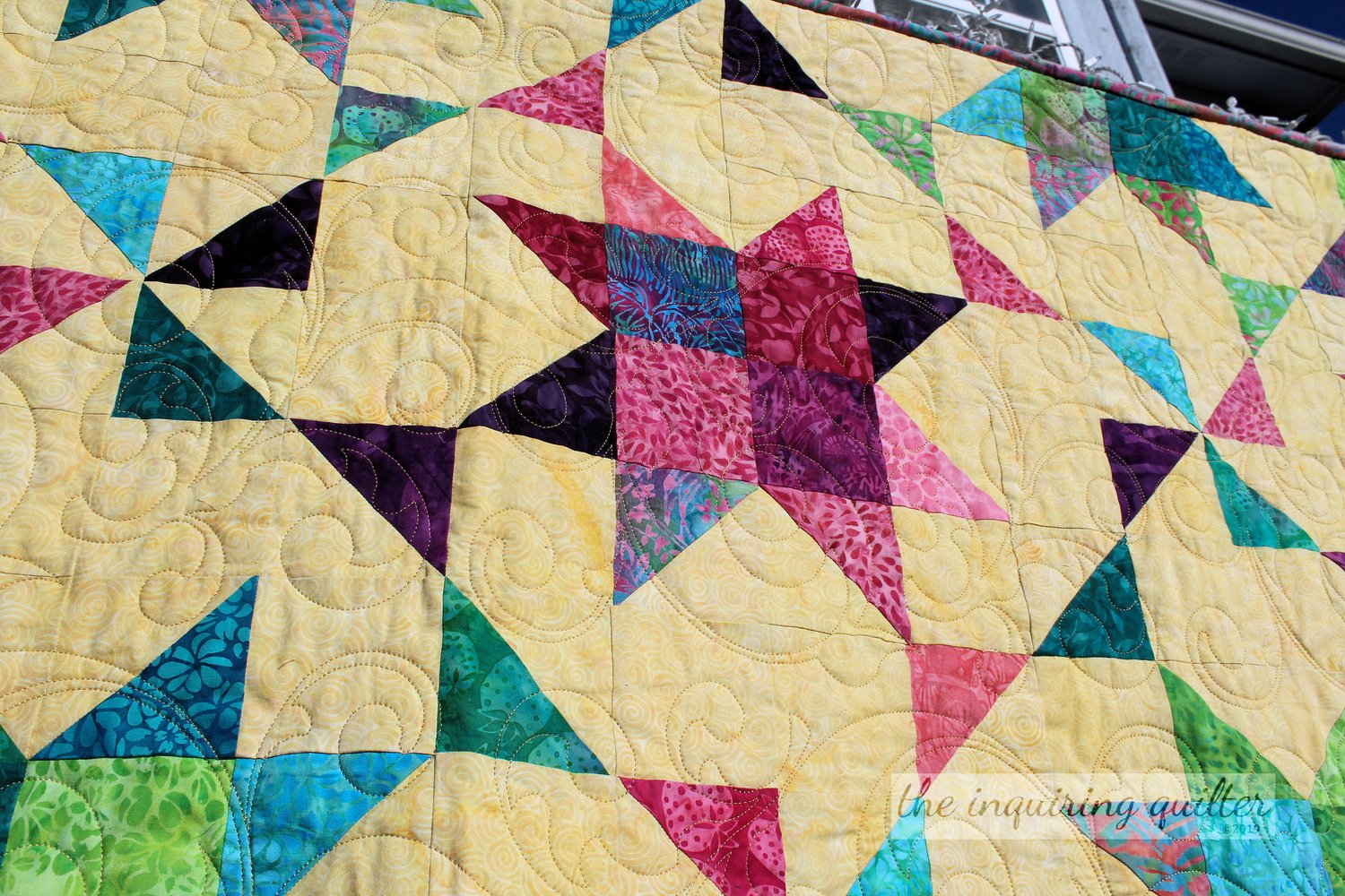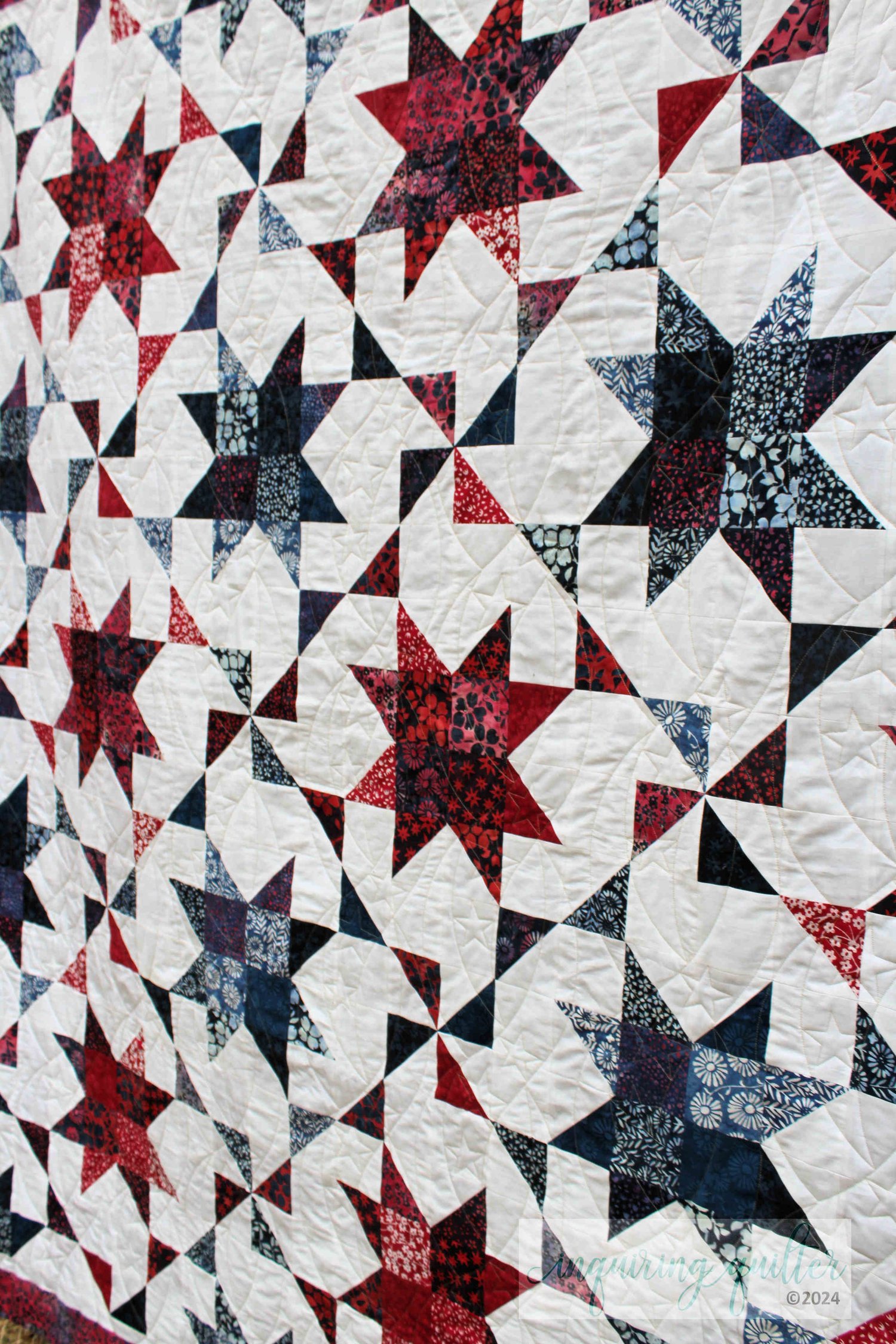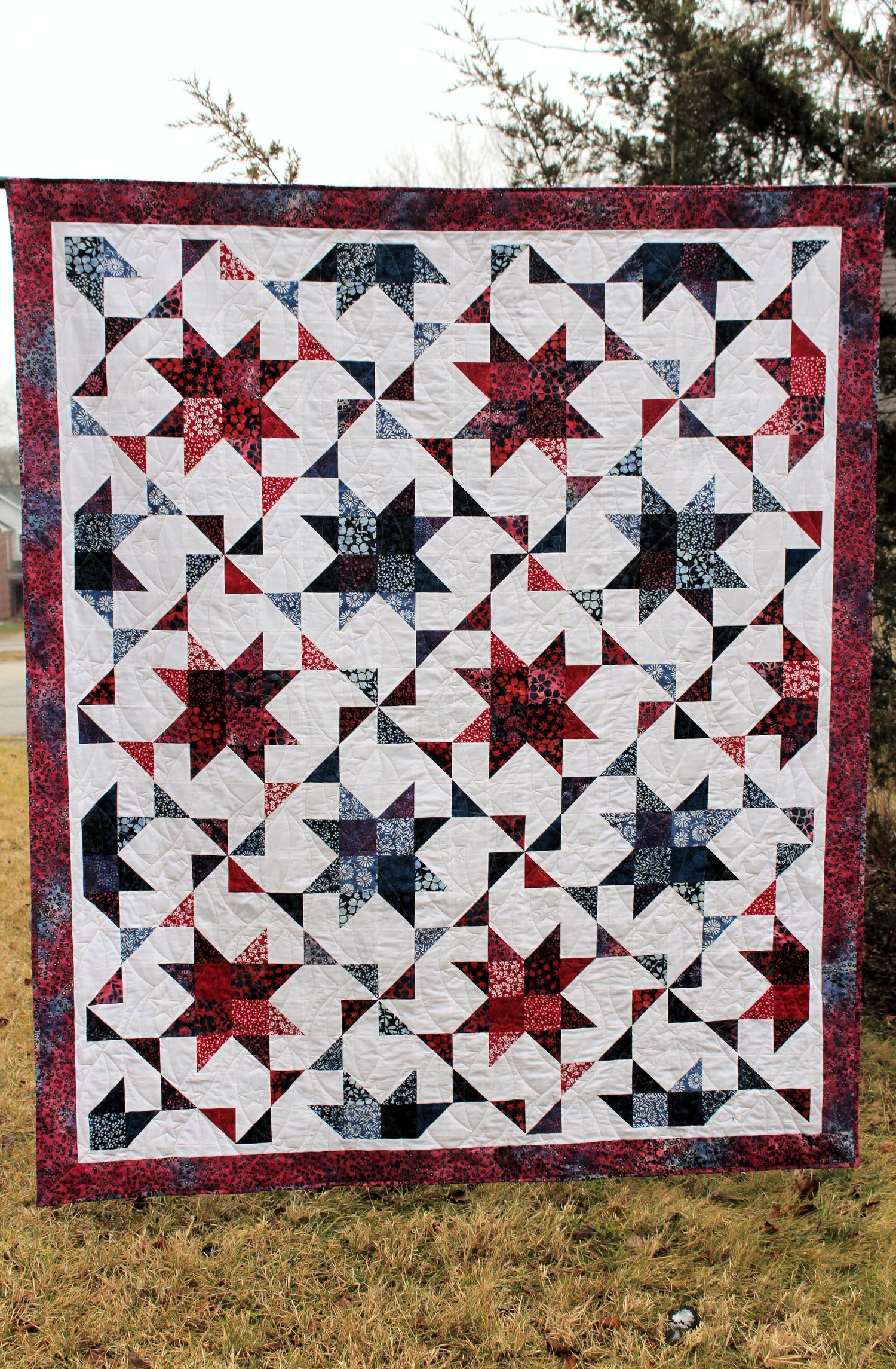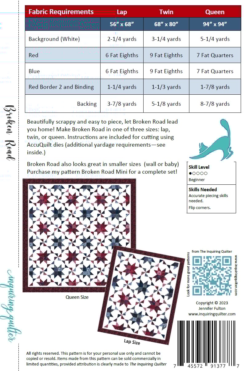 Beautifully scrappy, Broken Road spins with color! Let Broken Road lead you home. The cover quilt is shown in Twin size and uses the Island Batik Red White and Blooms collection. Chose any two colors and make Broken Road in one of three sizes! Additional instructions included for cutting with AccuQuilt.