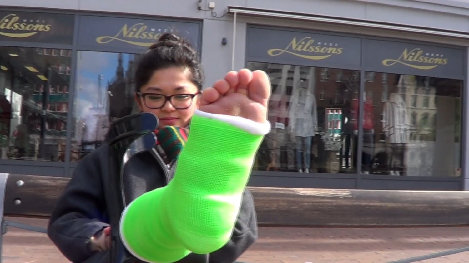 Vera crutch around on teh streets in the city with her green SLC.Since it´s Sunday there is almost no people out and Vera find a empty bench she can sit down on.She put her SLC up on a crutch sp we get a nice view of the bottom of her cast and toes.