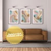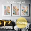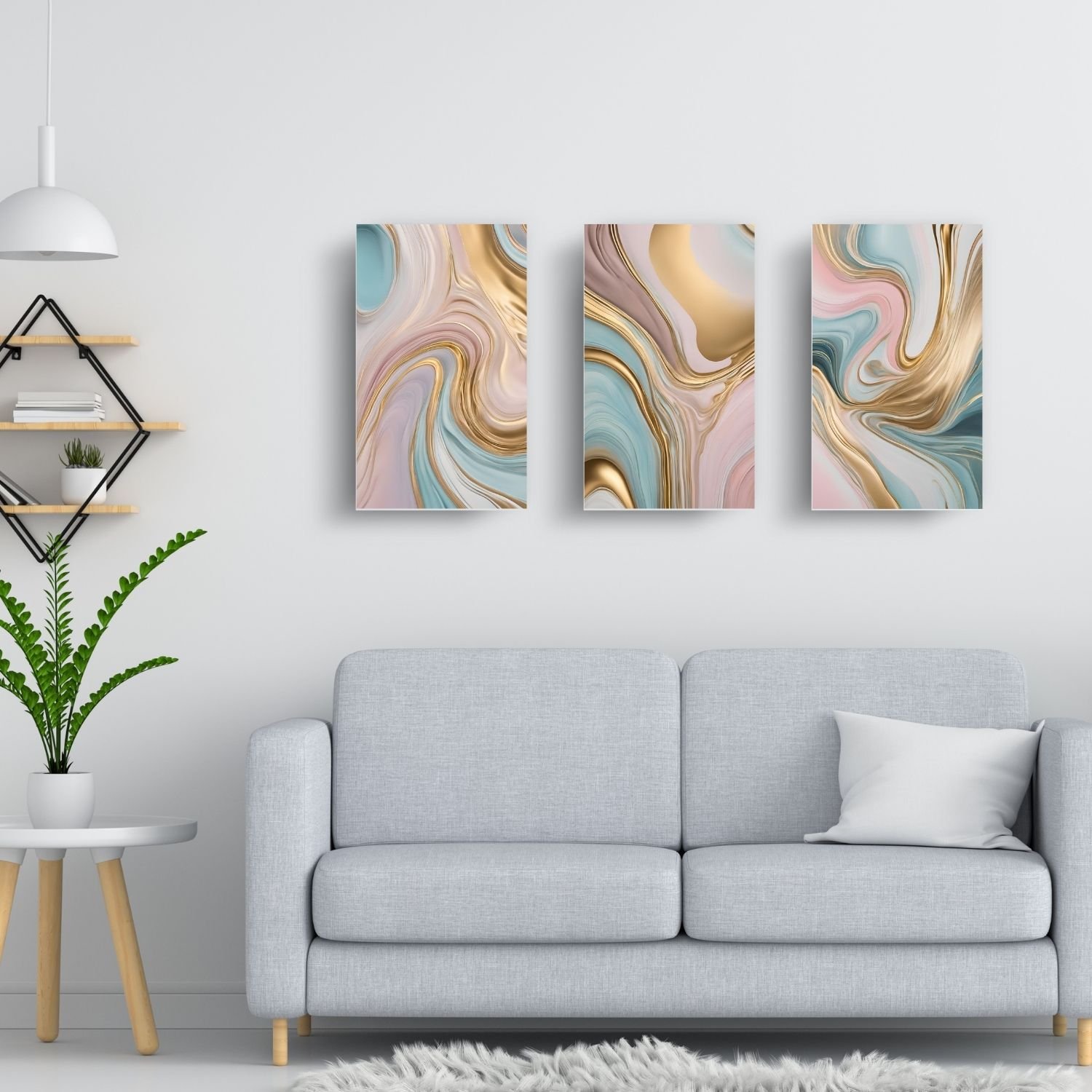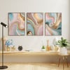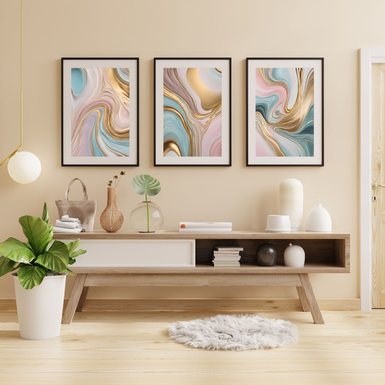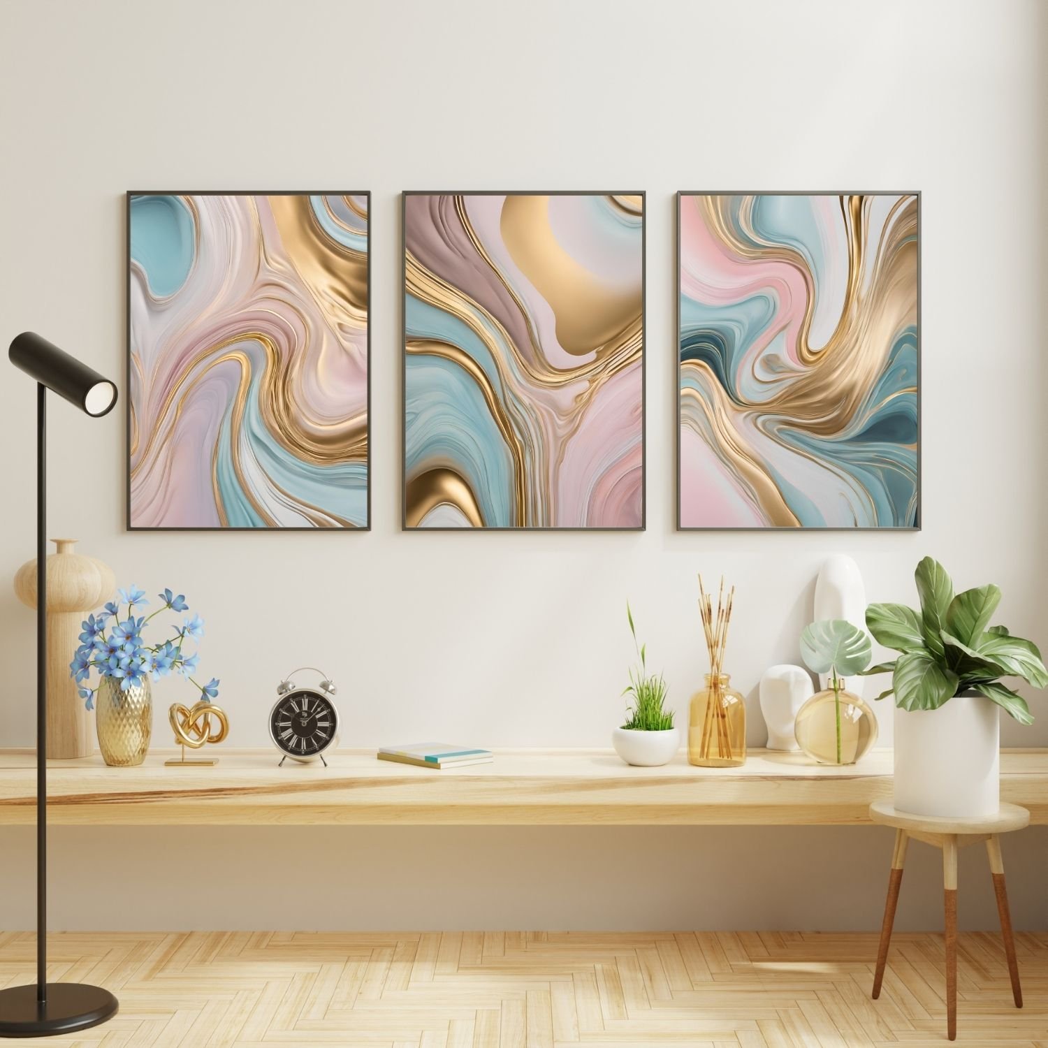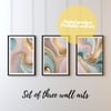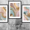 Keys: abstract, art, vibrant, bright, color, square, set, 3, deco, poster, wall art, new home, room decoration, cactus flowers, liquid, gold, blue, art.pink, soft, cream, calm,