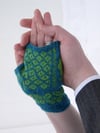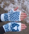Popinjays are a pair of stranded-knit hand-warmers featuring a juxtaposition between warm-weather tropical birds and cold-weather Nordic knitwear.