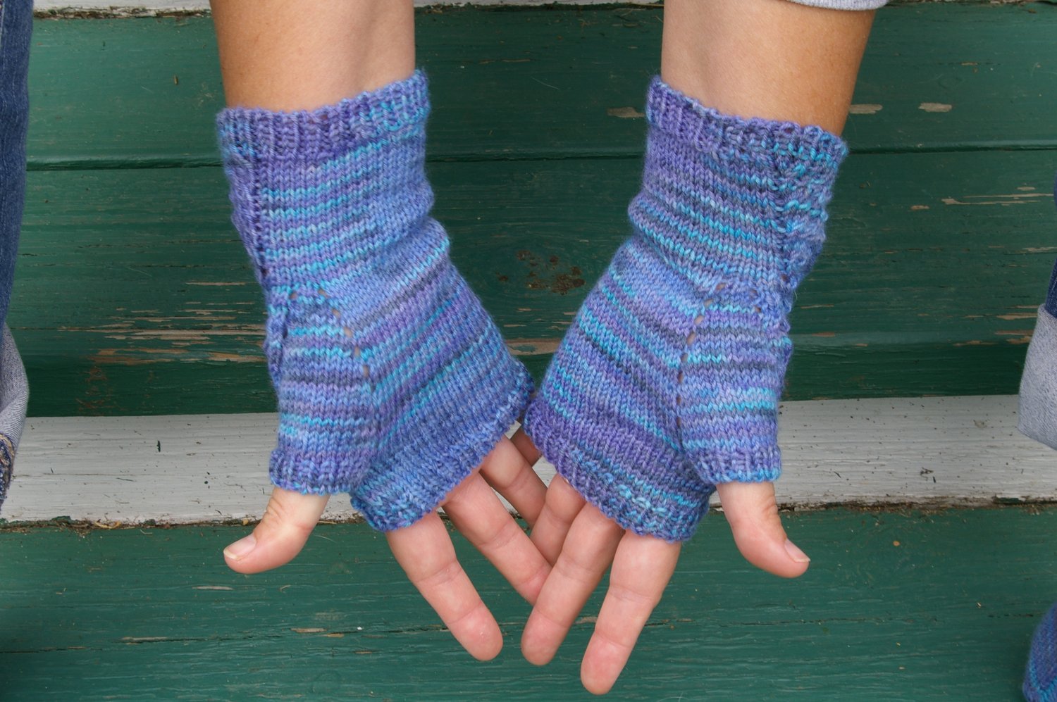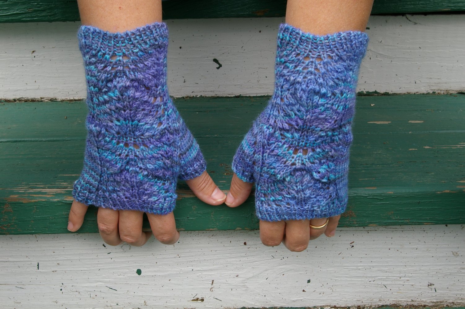 The mitts have the lace on the back of the hand only, with a thumb gusset accented by yarnovers for an extra touch of femininity.