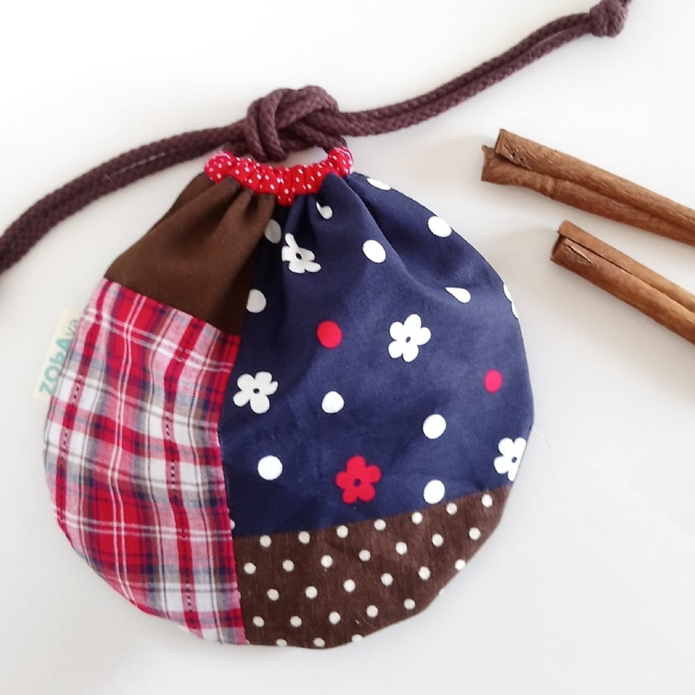 This originally designed round patchwork drawstring bag is fully lined. It can hold small things in daily life such as cosmetics, power bank, earphones and chargers, and sanitary items, etc. and thus keep the tote or handbag tidy. It can also be used as a small bag when going out for a short walk.