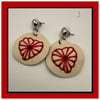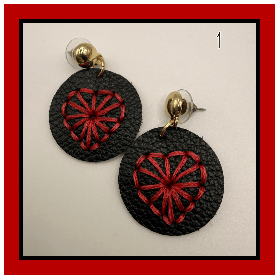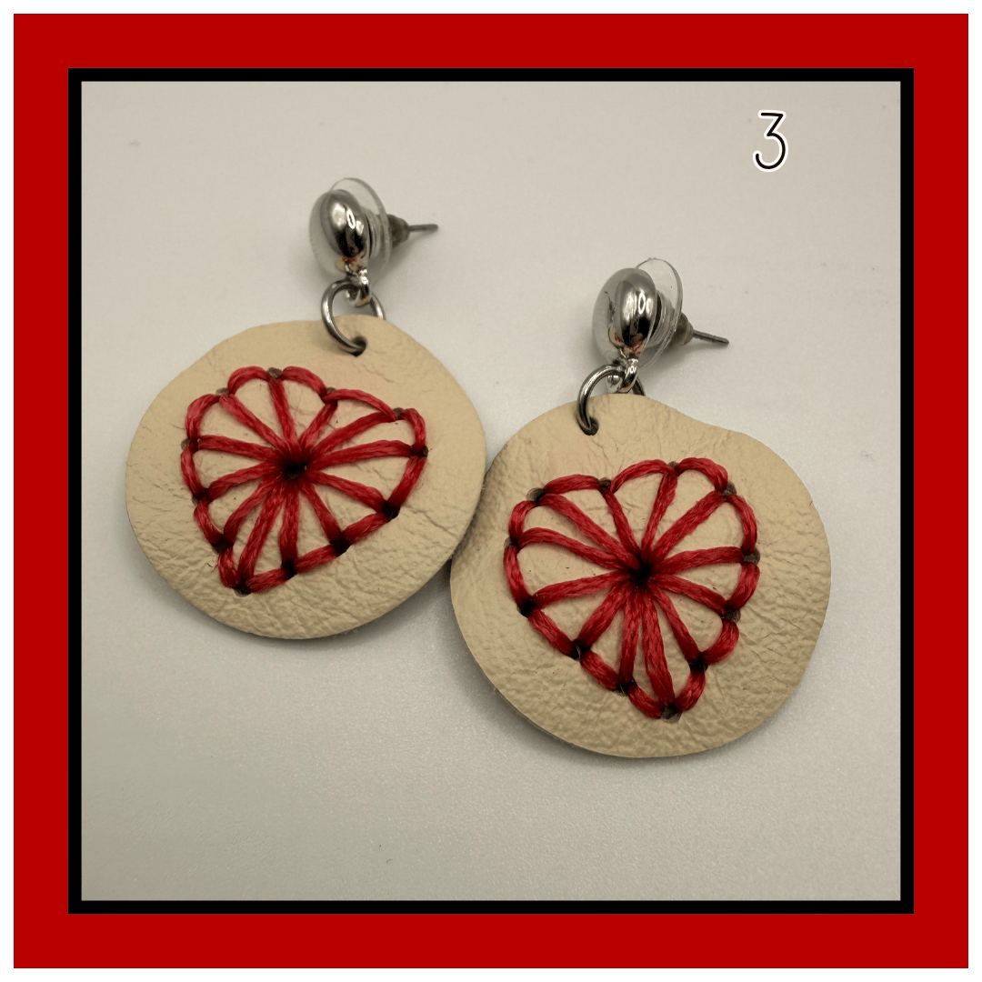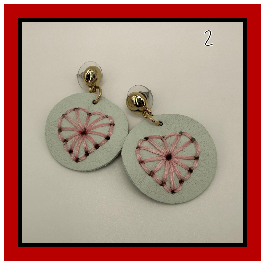 Each pair features a hand-stitched heart design set on a soft leather disc, giving texture, warmth, and just the right amount of whimsy. No two stitches are ever exactly the same — that’s part of her charm.