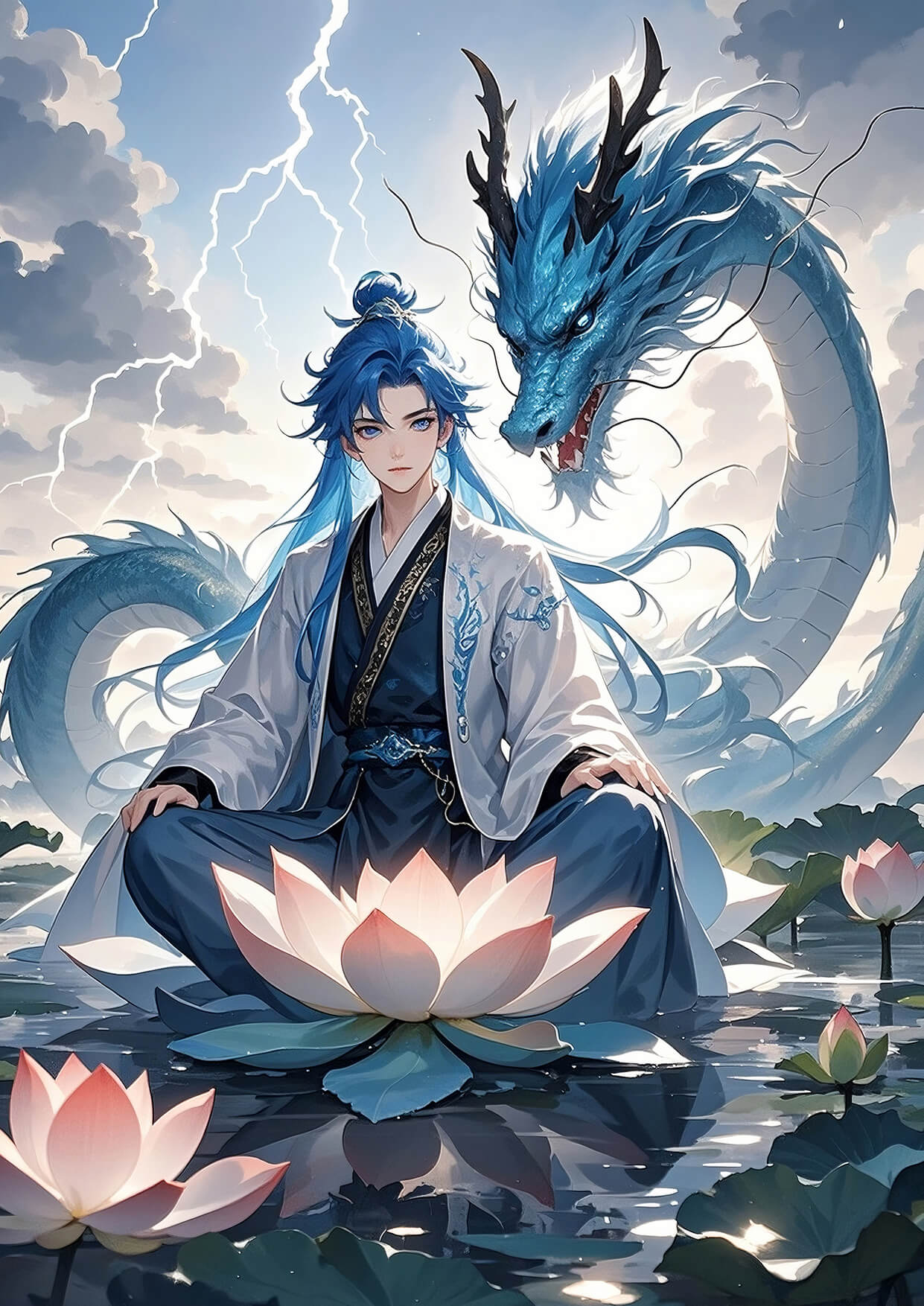 A powerful image of a serene young man in traditional robes, sitting on a lotus pond under the protection of a majestic blue dragon. Surrounded by water lilies, stormy skies, and divine energy, this artwork symbolizes wisdom, spiritual awakening, and the attraction of good fortune. A perfect piece for your meditation space or as a symbolic gift of strength and clarity.