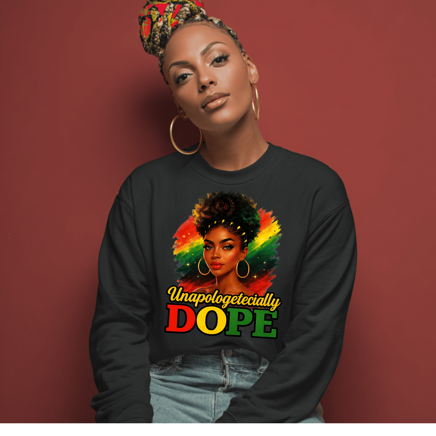 The Unapologetecially DOPE – Natural Puff Edition is a bold celebration of Black beauty, confidence, and cultural pride. Featuring a stunning melanin queen with a voluminous natural puff, gold hoops, and radiant red–gold–green brush strokes, this design honors natural hair and fearless self-expression.