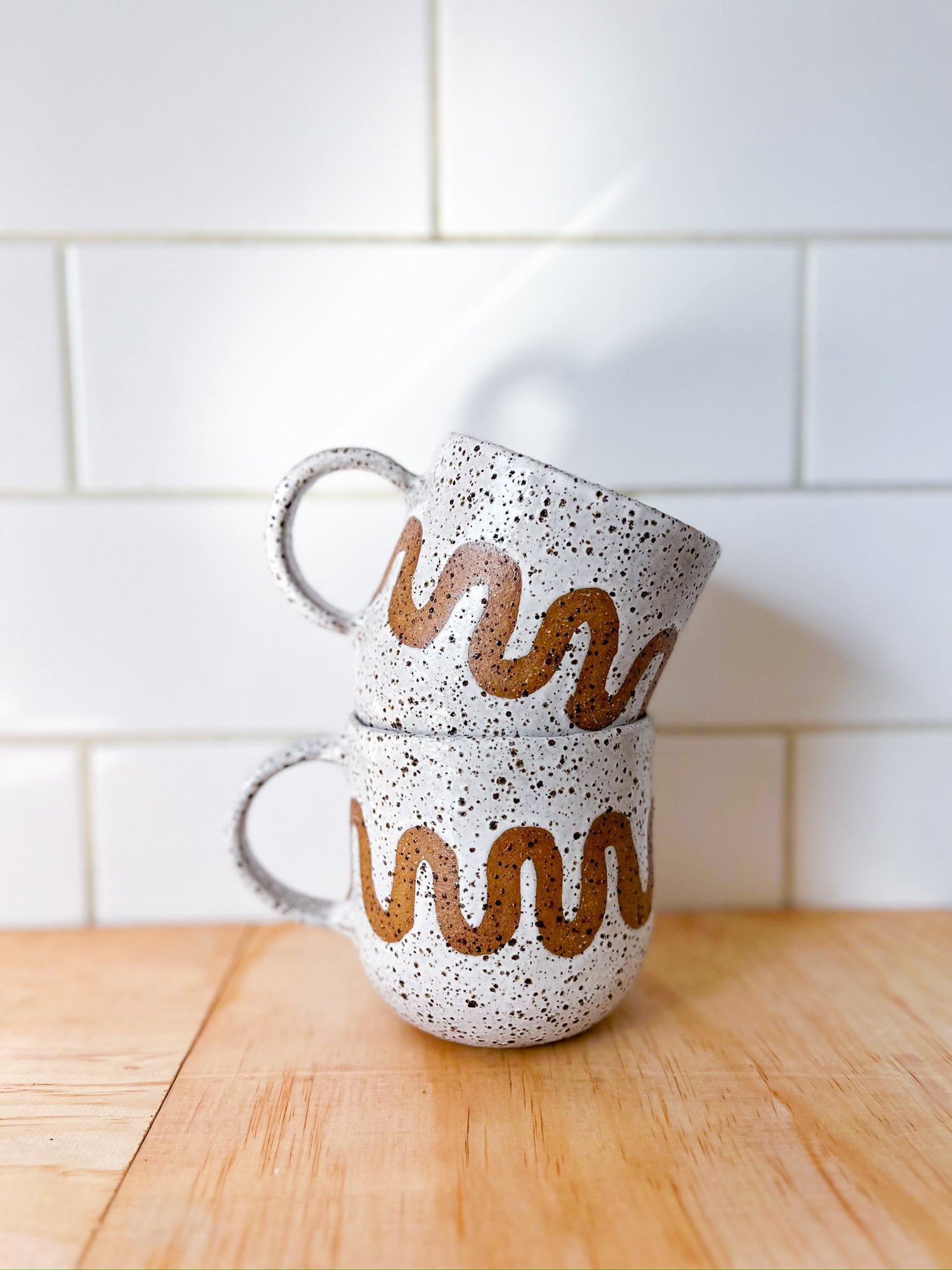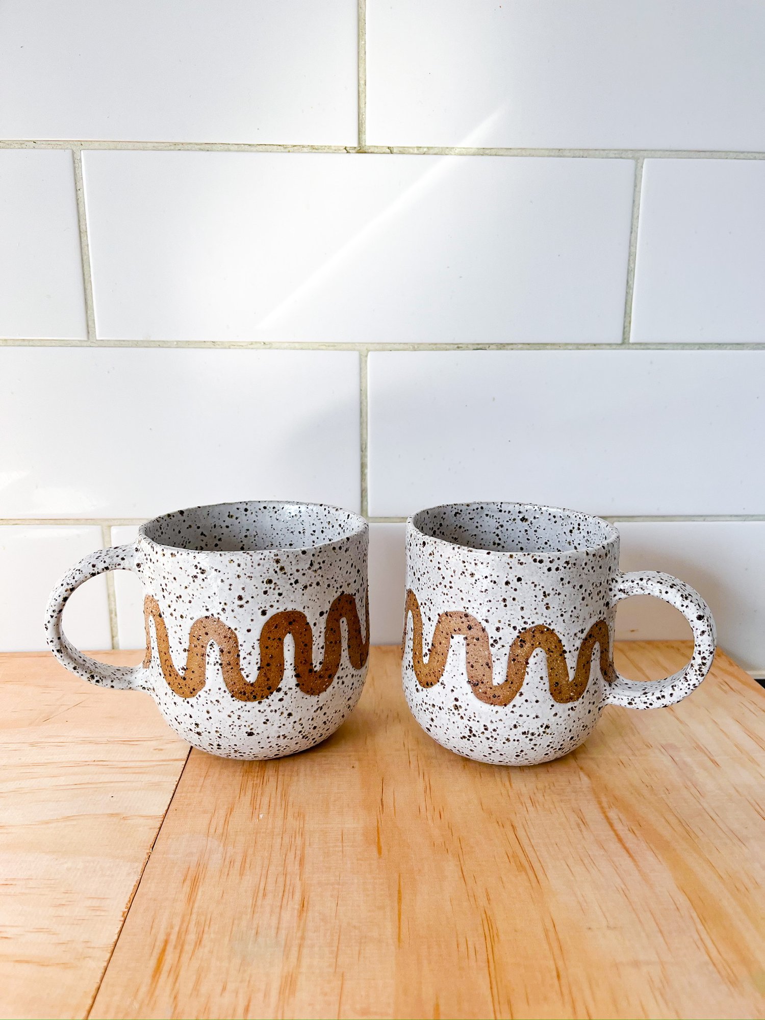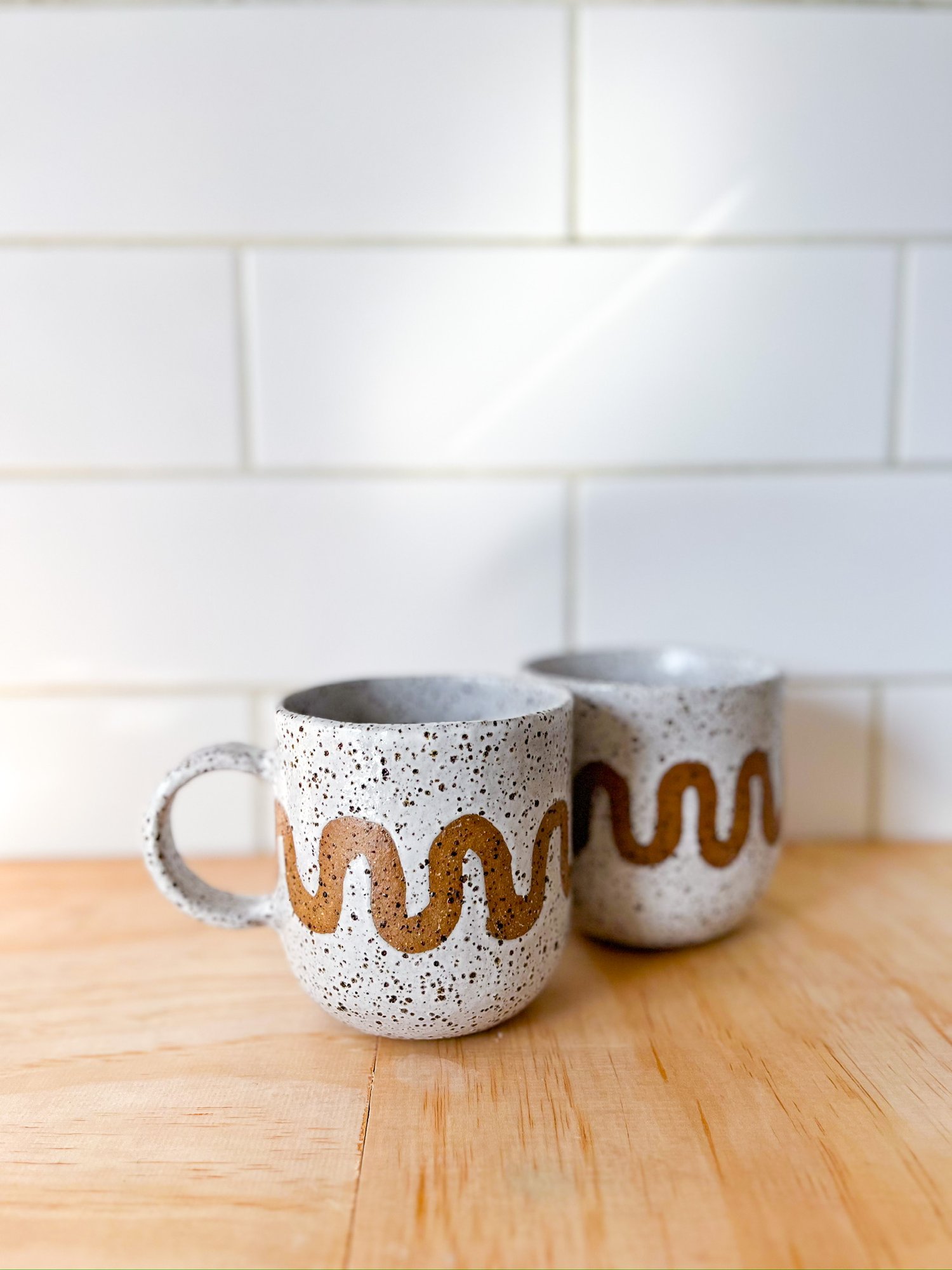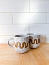 This hand-built, speckled stoneware mug features an unglazed wave motif that flows around the form — echoing the soft rise and fall of waves folding into the shore.