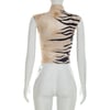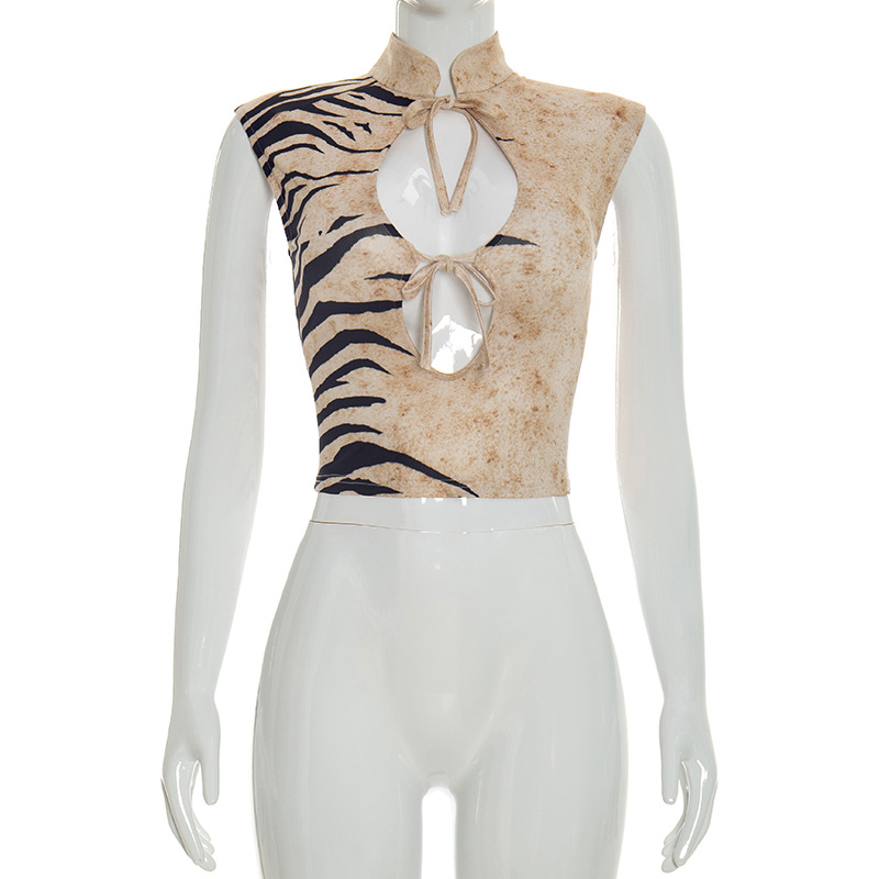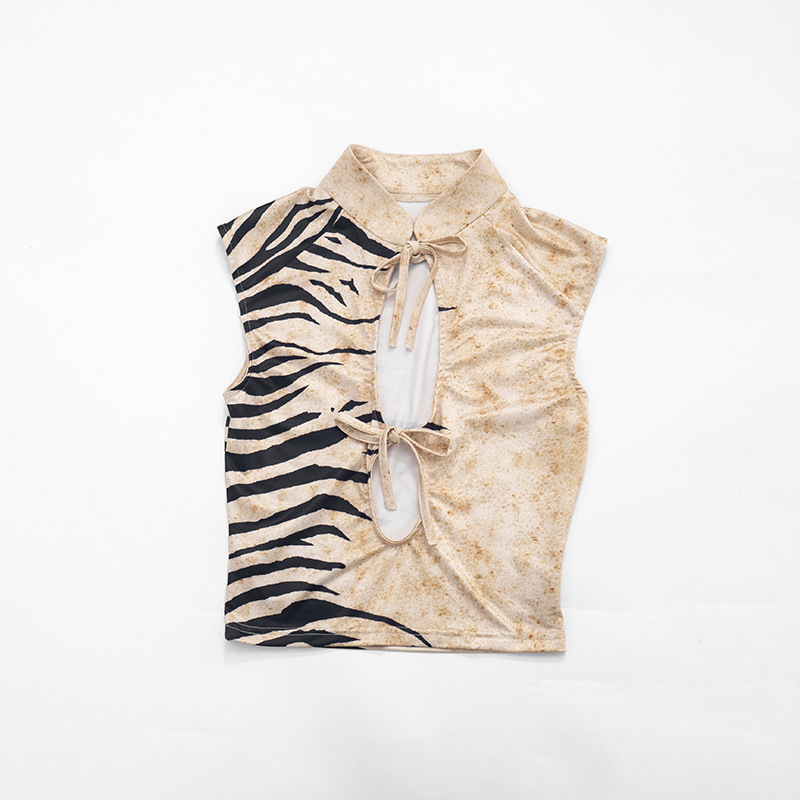 Niche design retro new Chinese-style zebra prints apricot hollow-out lace-up stand collar sleeveless top