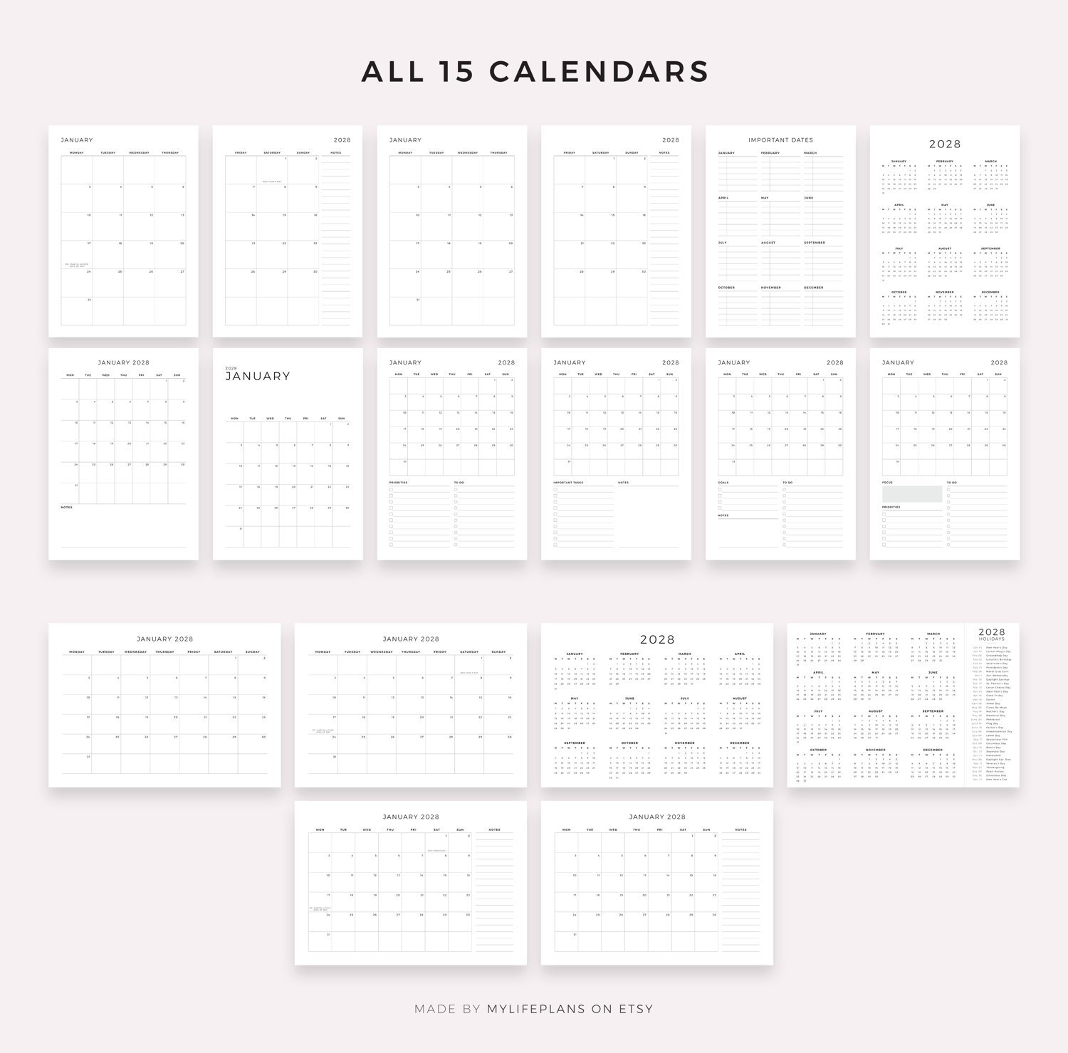 2028 calendar bundle. It includes 15 unique printable calendars to choose from. Just download, print and get started right away!