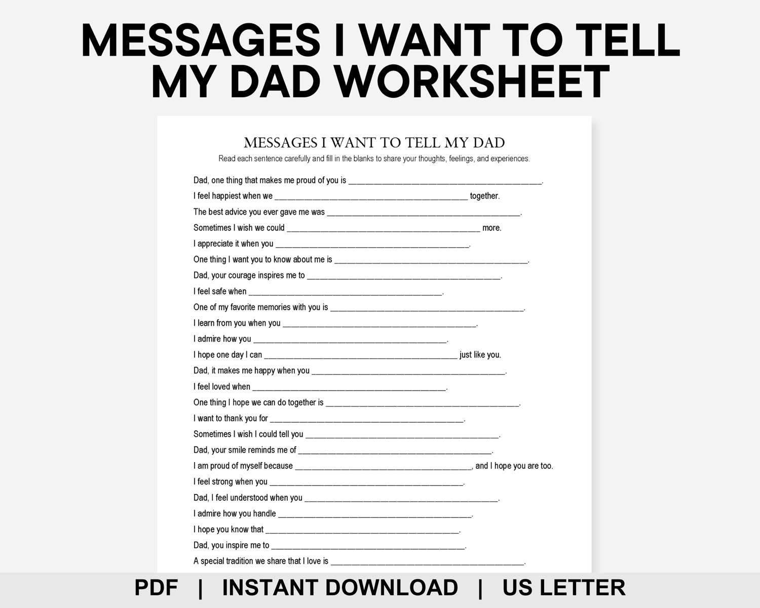 Messages I Want to Tell My Dad Worksheet, All About My Dad, Father Son Journal, Memory Journal, Fathers Day Gift, Family Therapy, Parenting
