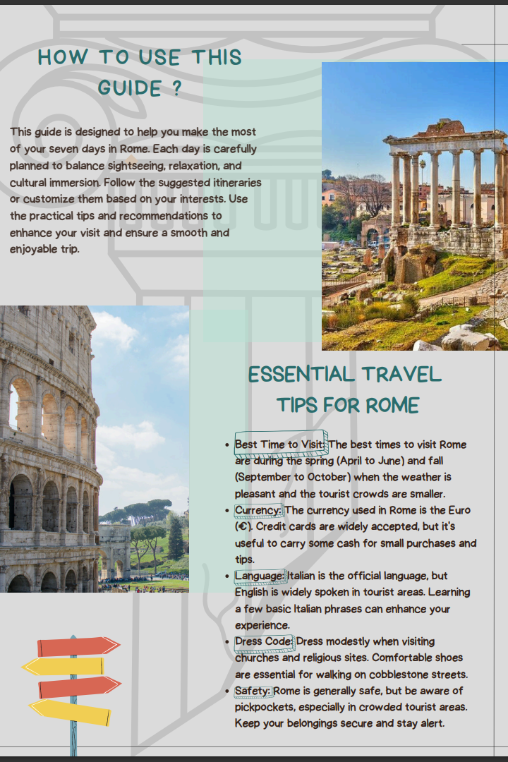 Planning a trip to Rome? This guide is designed to help you make the most of your seven days in Rome. Each day is carefully planned to balance sightseeing, relaxation, and cultural immersion. Follow the suggested itineraries or customize them based on your interests. Use the practical tips and recommendations to enhance your visit and ensure a smooth and enjoyable trip.