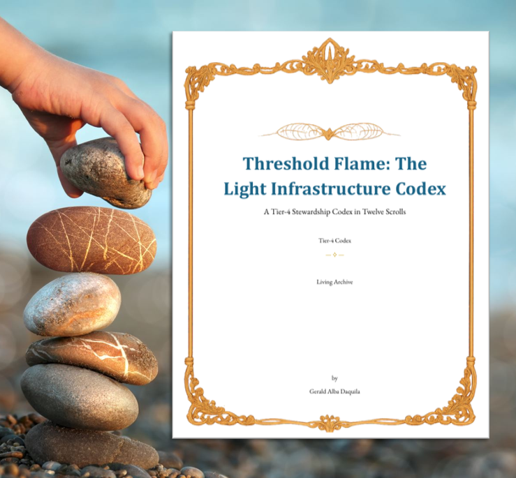 Threshold Flame Light Infrastructure (Complete 12-Volume Set) is a Tier-4 stewardship toolkit composed of twelve interlocking scrolls governing ethical readiness, capacity, and responsible transmission of planetary-scale work. Designed as an operational Codex rather than a belief system, it supports embodied discernment and coherence without doctrine or hierarchy.
