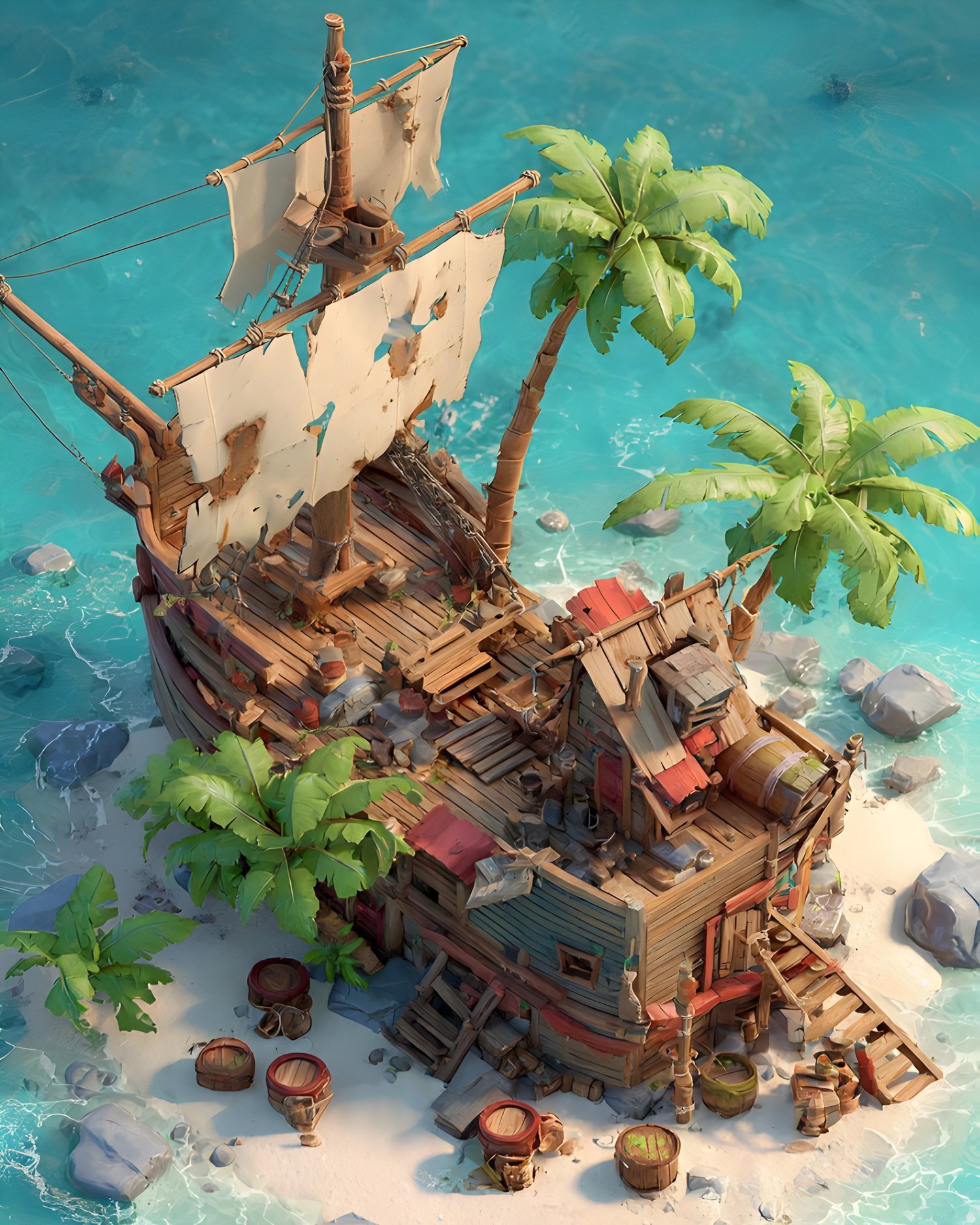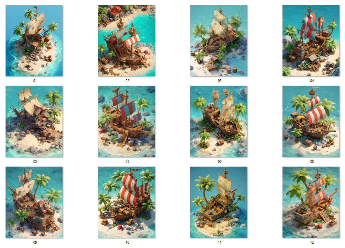 12 AI-generated JPG digital art prints – Pirate Shipwreck Island – 12 Kids Tropical Adventure Art Prints