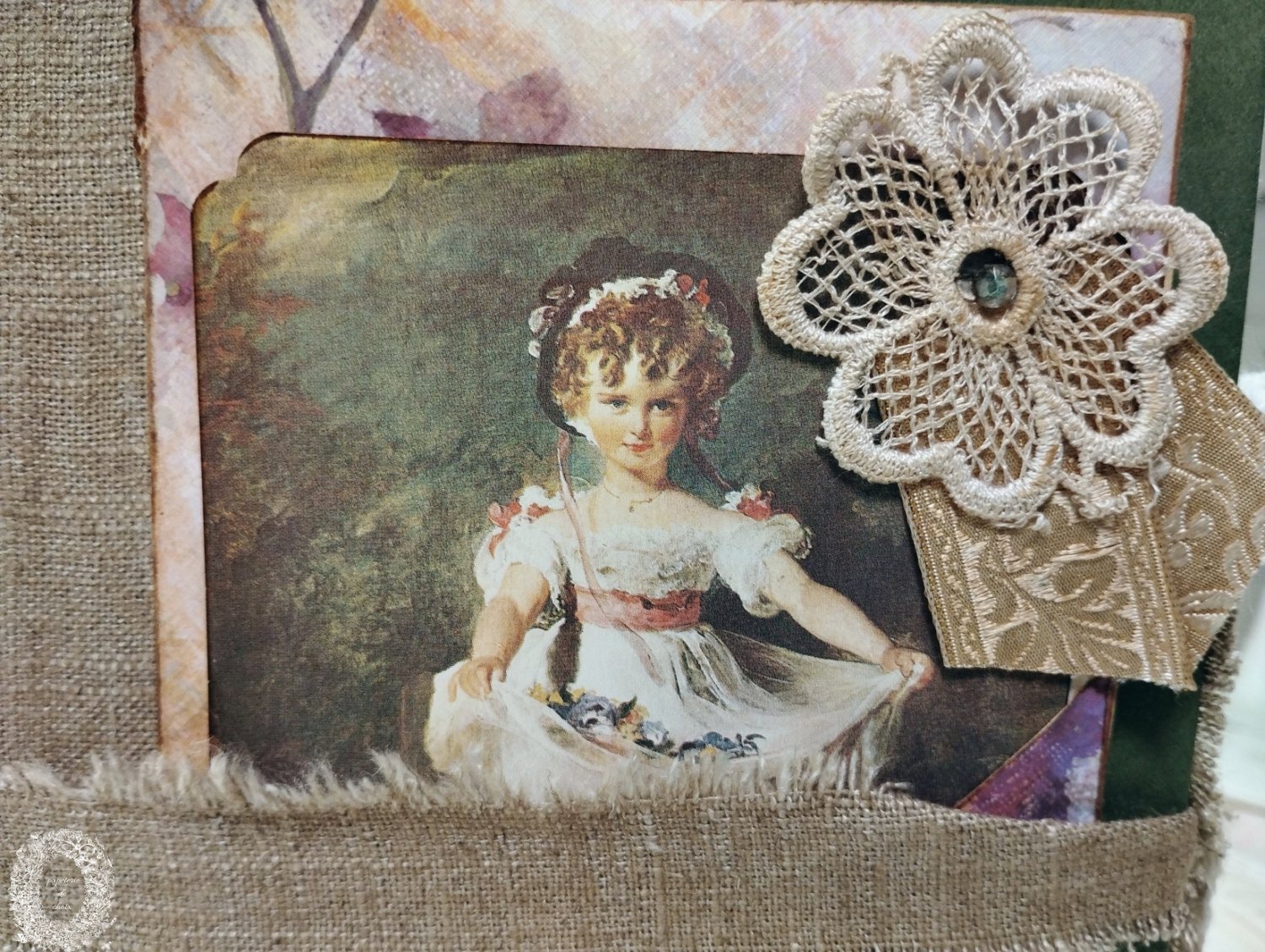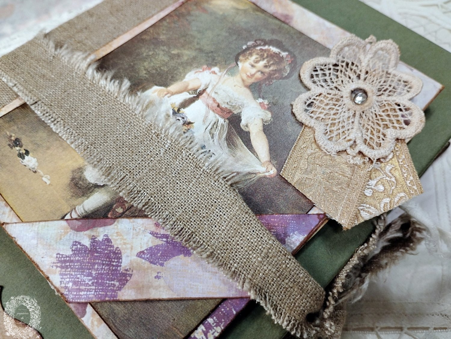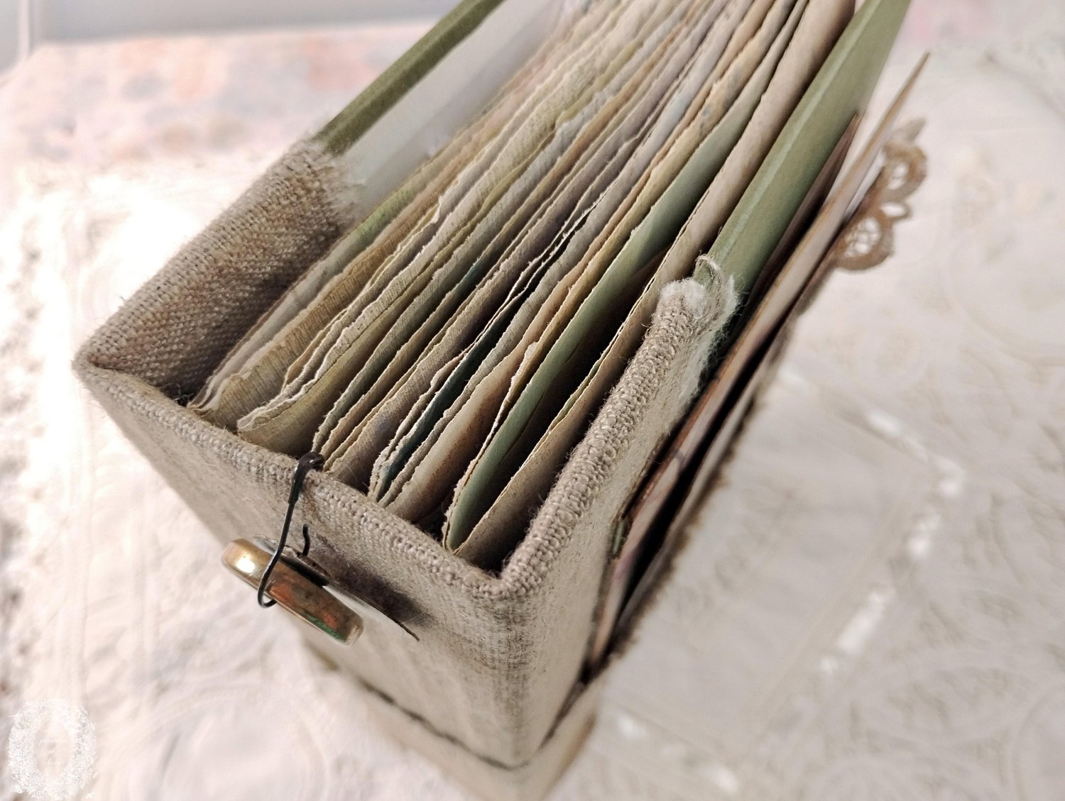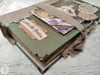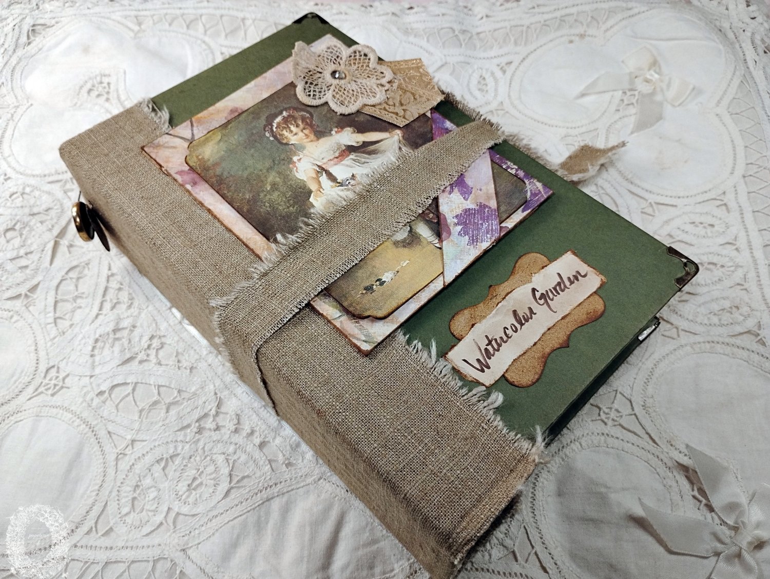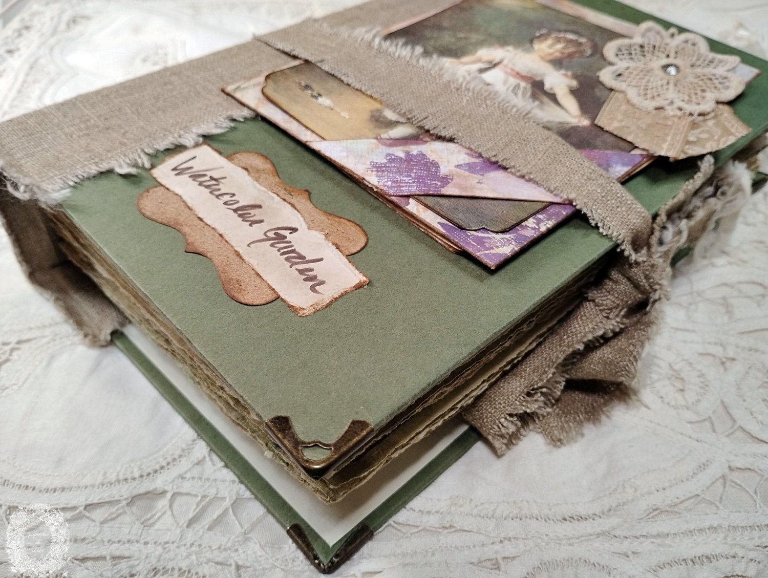 Watercolor Garden is a large journal measuring 9.5 inches tall x 6 inches wide x 2.5 inches thick. It has 166 pages, 3 tags, 38 pockets/tucks, 35 journaling cards, 8 envelopes and 7 special ephemera within 5 signatures. Inspiration can come from various things, and the inspirationfor this journal came from a vintage watercolor instruction book. The rustic envelopes in the journal are made from two of the pages.