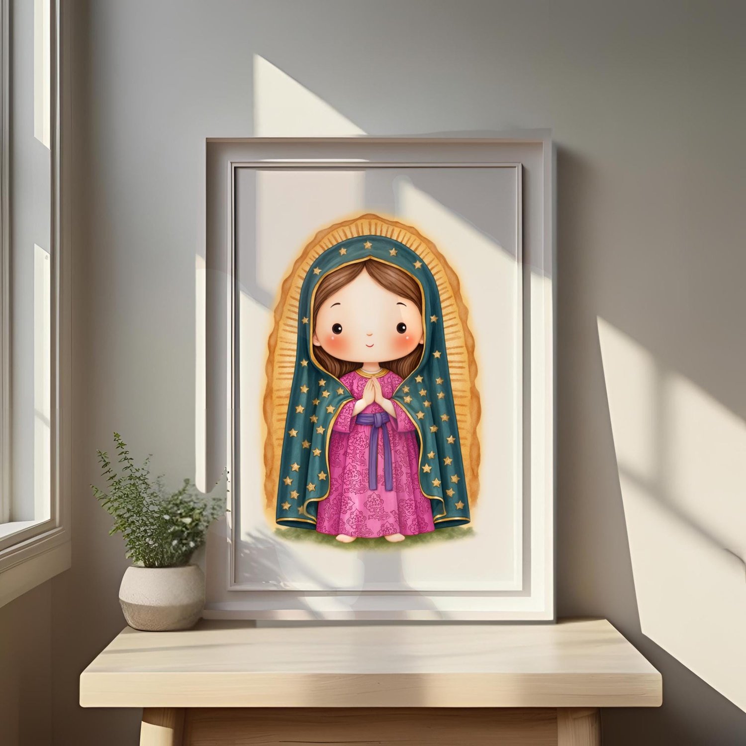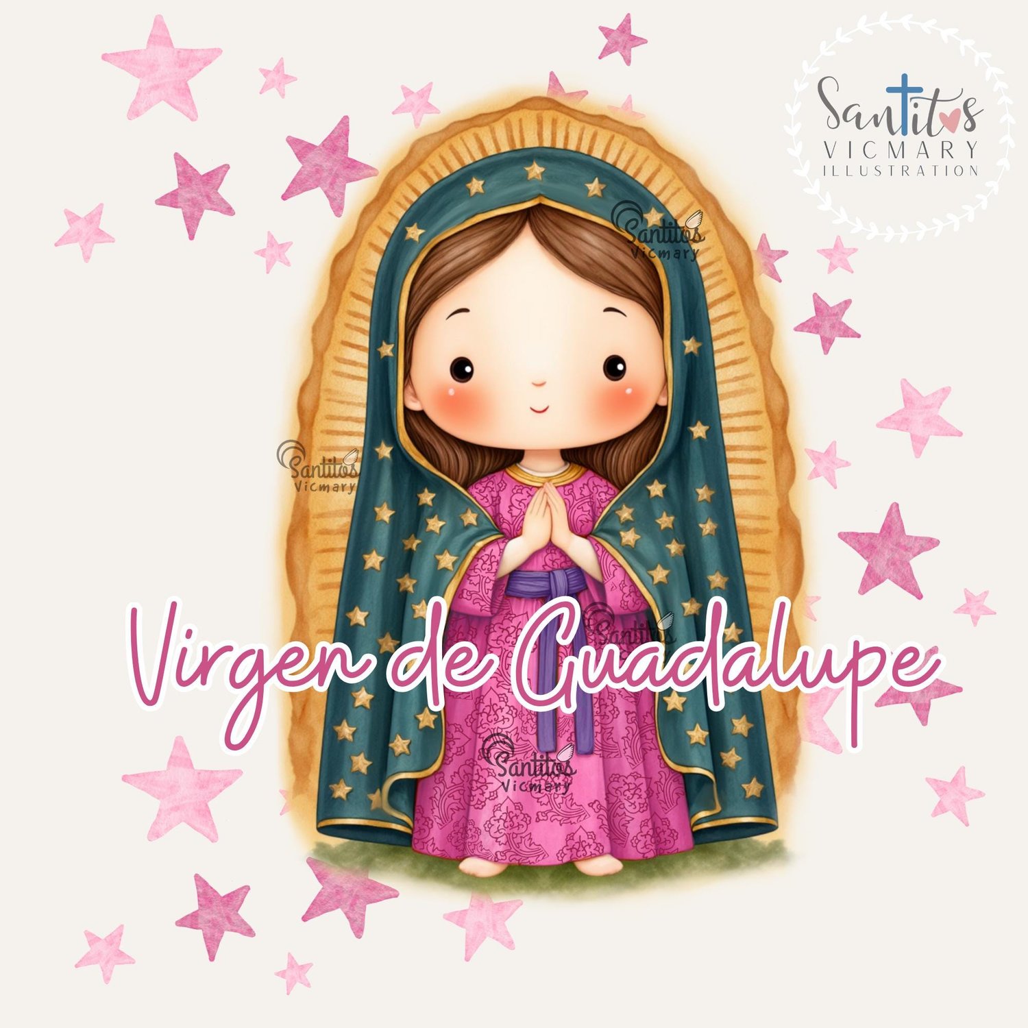 Bring home a vibrant, Digital Download PNG of the Virgin of Guadalupe, painted in rich fuchsia and bright colors in a watercolor style. This beautiful Catholic clipart features:
