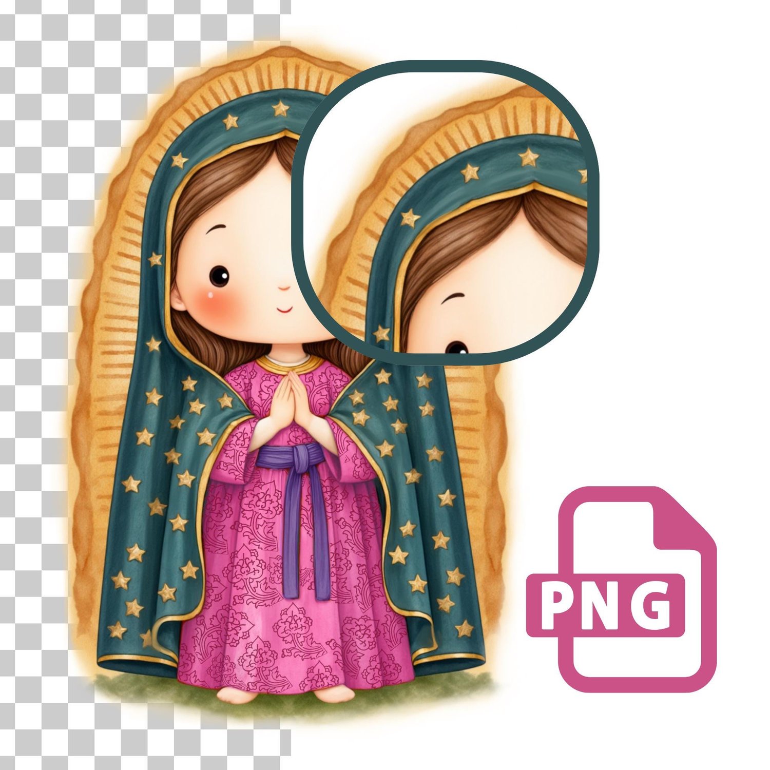 Perfect for Mexican Catholic art lovers, faith-based products, Our Lady of Guadalupe crafts, or anyone seeking a unique and colorful religious PNG for events or sacred décor.