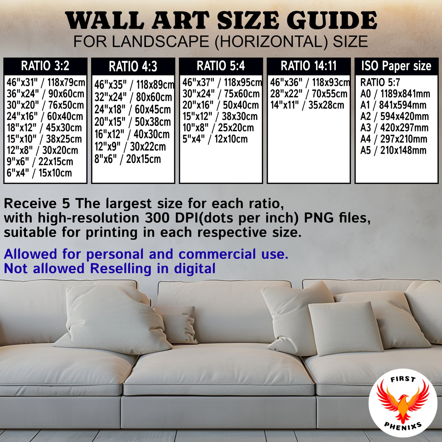 Purchase our digital wall art, and you'll receive a PDF link to download a total of 15 high-quality images (300dpi). These images are variations of the 3 unique designs you see on the cover. Each of these designs is provided in 5 different sizes, ensuring versatility for your printing needs: