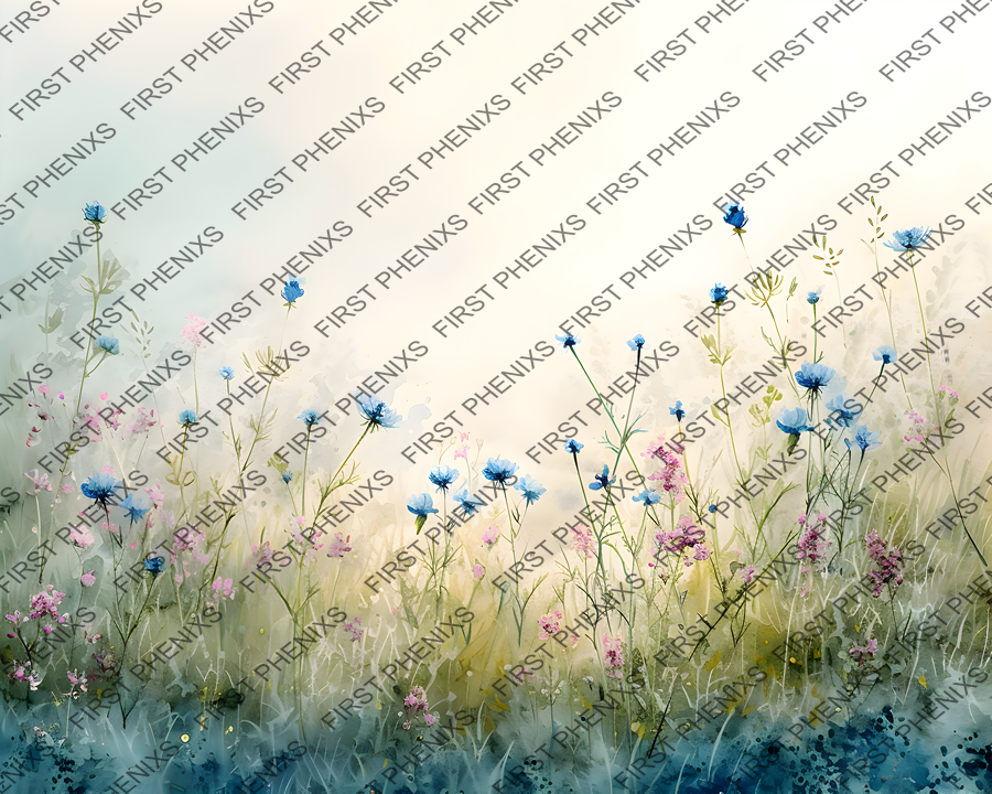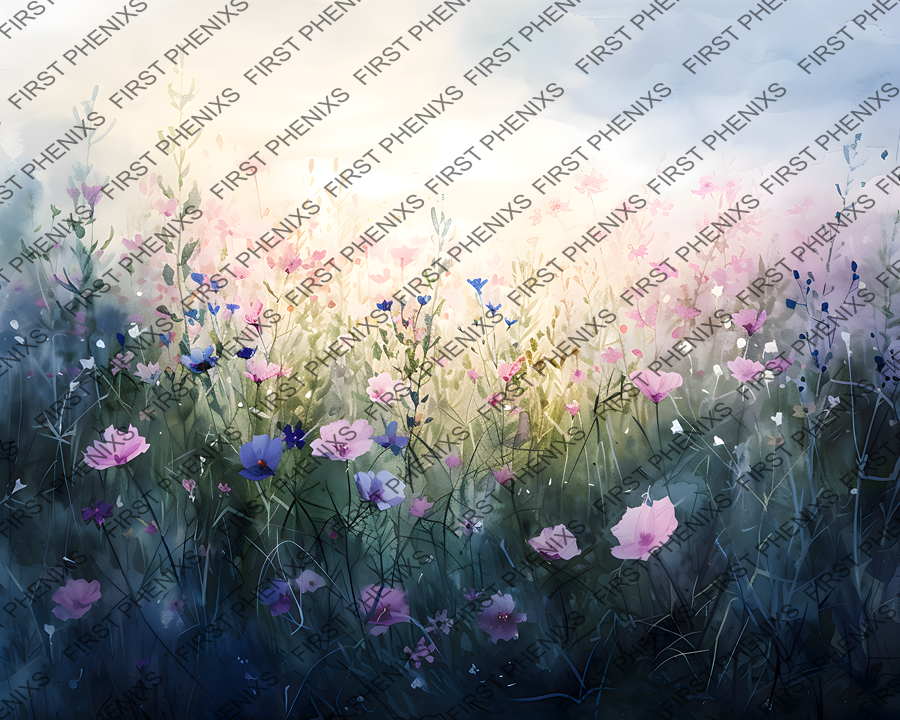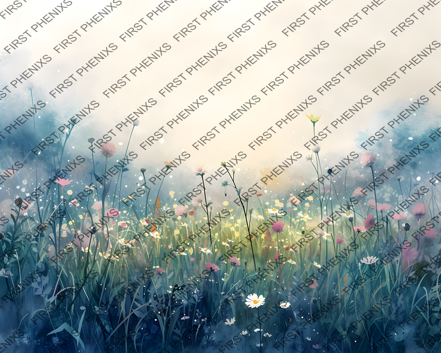 watercolor meadow, serene morning, wildflower landscape, digital download, nature prints, tranquil scenery, floral art, cool hues, dawn light, printable decor, botanical illustration, soft tones, meadow artwork